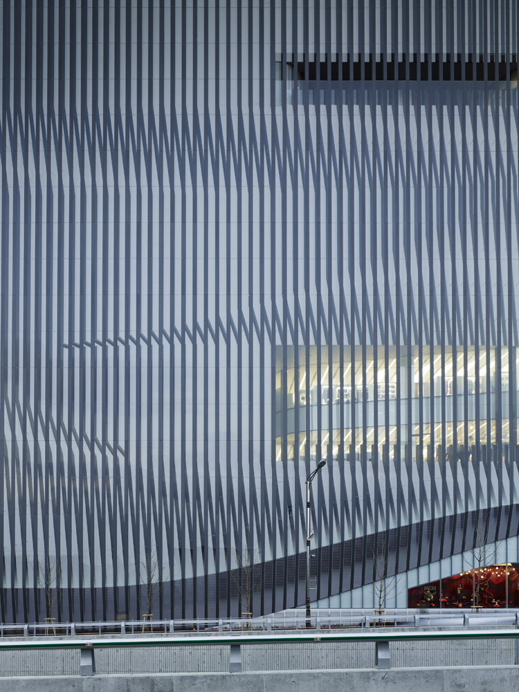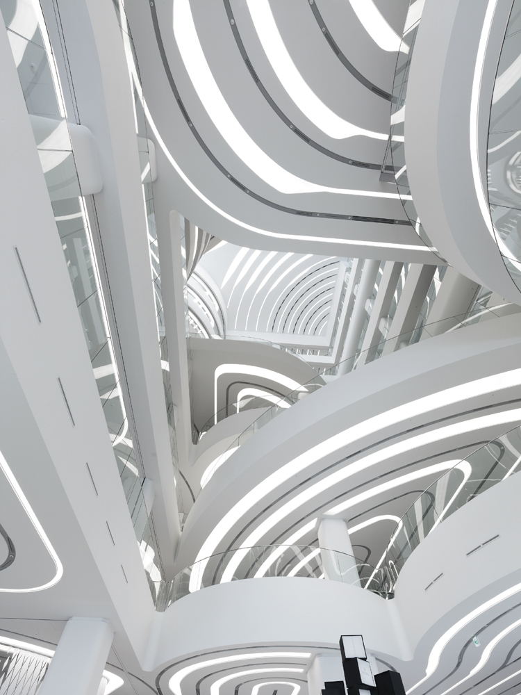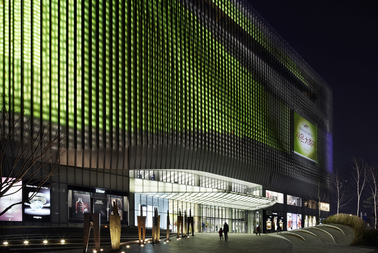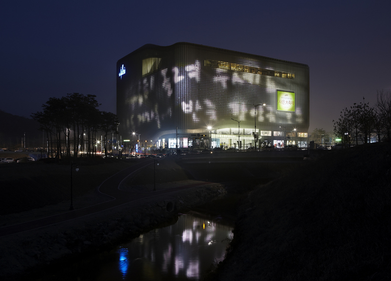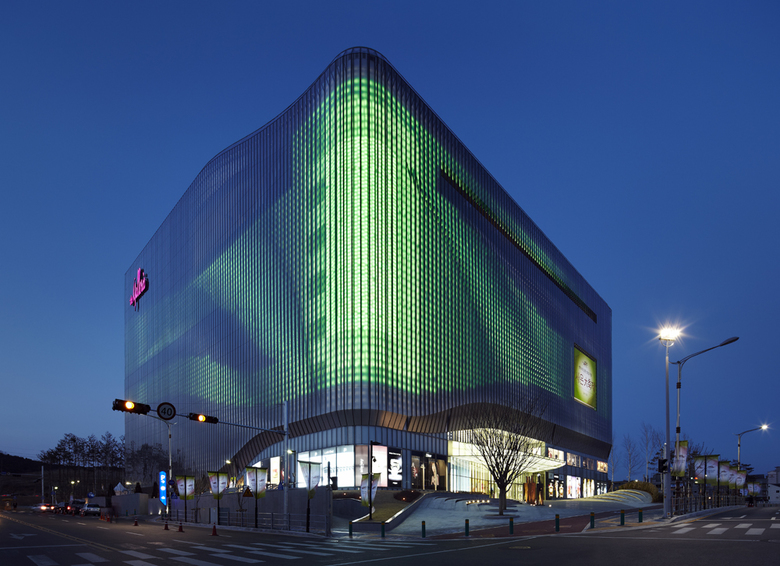 Dynamic Flow and optical illusion on a grand scale – The main architectural theme for the Galleria Cheonan is that of dynamic flow. This is found both inside and outside. The architecture of the 66,000 m ² building responds to its central position by presenting a deliberately changeable aspect all-around. Moiré effects, special lighting and animations ensure that the outside changes appearance constantly.