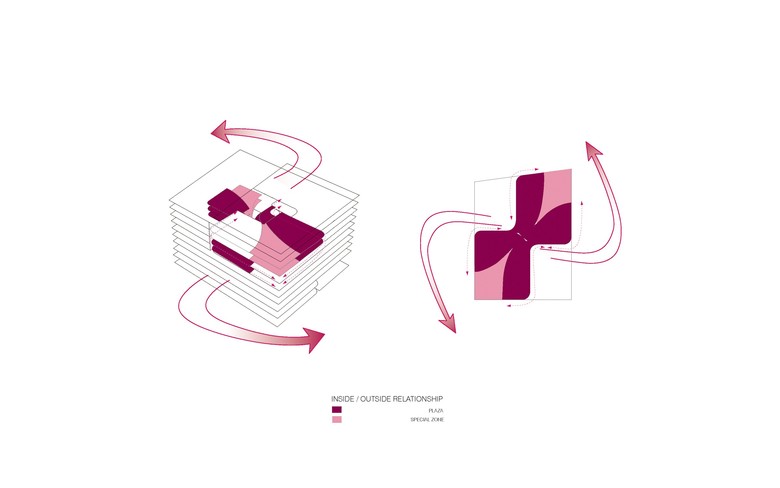 The interior derives its character from the accumulation of rounded plateaus on long columns. The repetition of curves, enhanced by coiled strip lighting in the ceilings of the platforms, gives the interior its distinctive character. Four stacked programme clusters, each encompassing three storeys and containing public plateaus, are linked to the central void. This organisation propels a fluent upstream flow of people through the building, from the ground floor atrium to the roof terrace. As the plateaus are positioned in a rotational manner in space, they enable the central space to encompass way finding, vertical circulation, orientation and act as main attractor of the department store. The spatial and visual connections within the space are designed to generate a lively and stimulating environment, in which the user is central.
