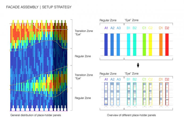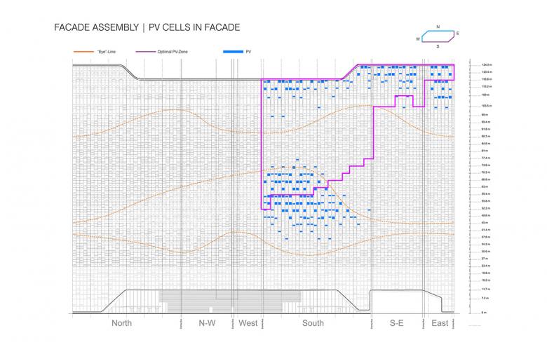 PV cells are placed on the opaque panels on the south / southeast facade at the open zones where there is an optimal amount of direct sunlight. Furthermore, PV panels are angled in the areas of the facade where energy from the sun can best be harvested.