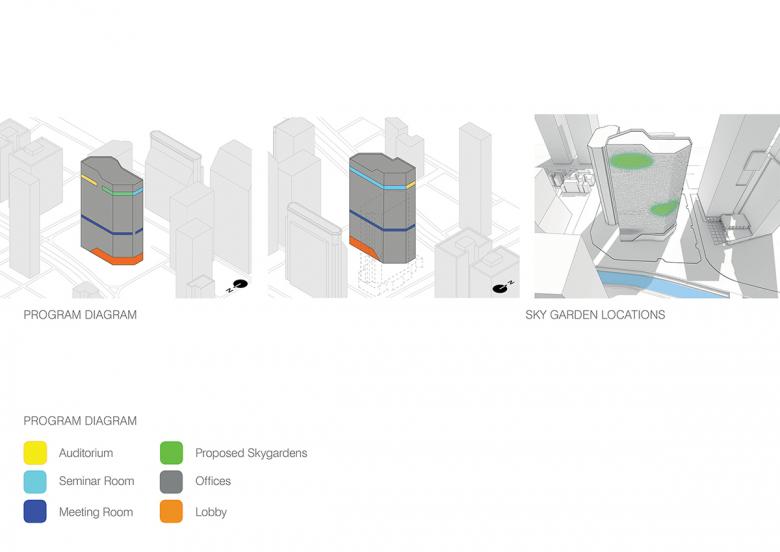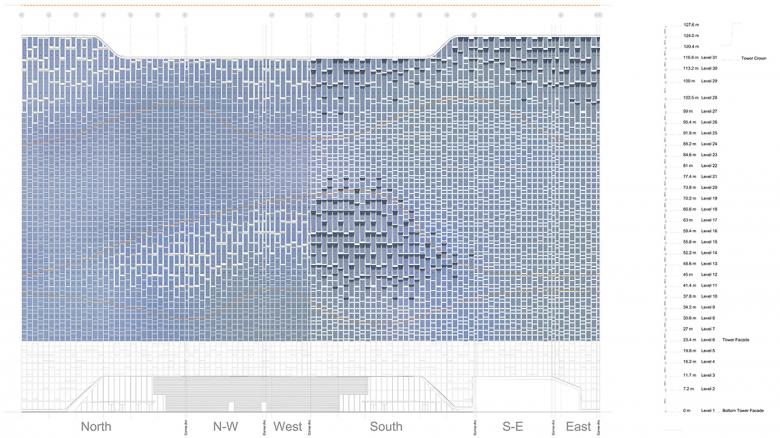 In the design for the Hanwha headquarter building the north facade opens to enable day lighting within the building, but becomes more opaque on the south facade, where the sun would otherwise have too much impact on the heat load of the building. Openings within the facade are further related to the views: opening up where views are possible, but becoming more compact on the side adjacent to the nearby buildings.