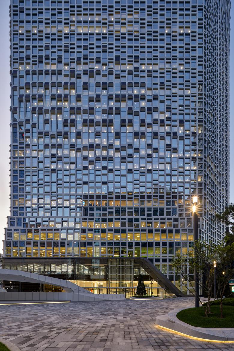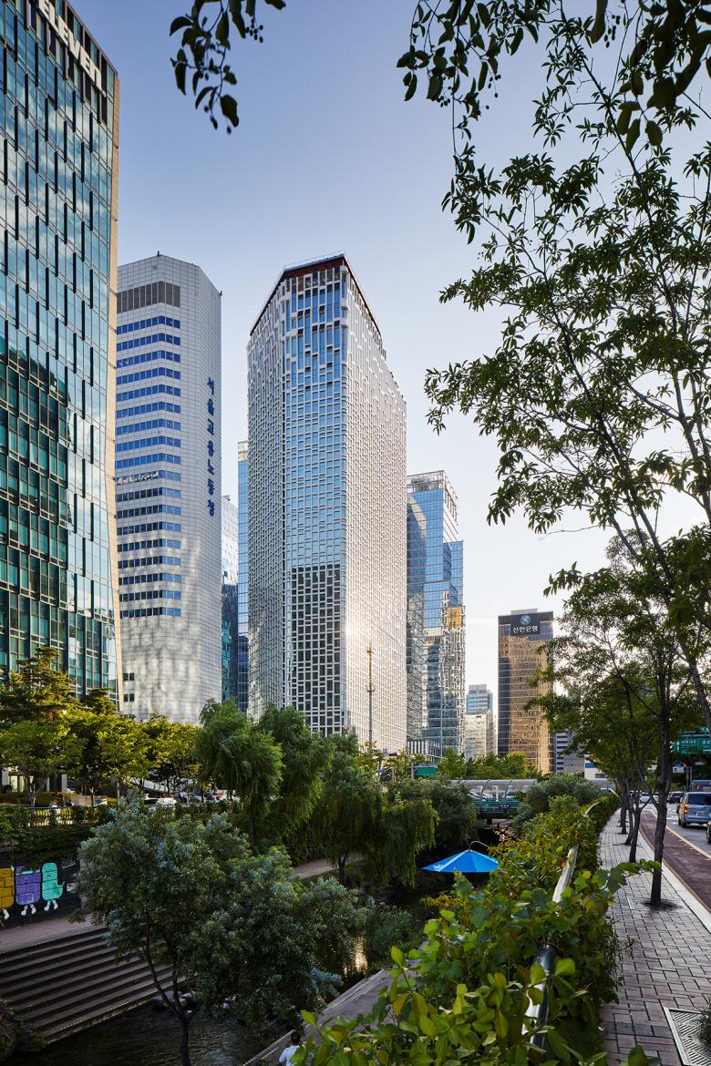 Located on the Cheonggyecheon in Seoul, the 57,696 m2 headquarter building was seen to no longer reflect Hanwha as one of the leading environmental technology providers in the world. For the competition to remodel the tower, UNStudio teamed with Arup (sustainability and facade consultant) and Loos van Vliet (landscape designer). Following the selection of the competition design, agLicht joined as lighting consultant.