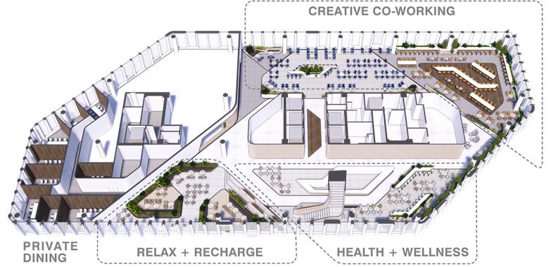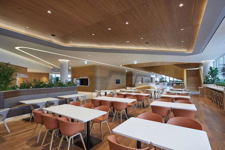 The 28th floor restaurant is a space of rest, relaxation and nourishment. Warm wood tones, natural materials and green planting create spaces where the employees of the headquarter building can come to recharge and rejuvenate. The restaurant is divided into multiple zones each catering to different types of cuisines and dining.