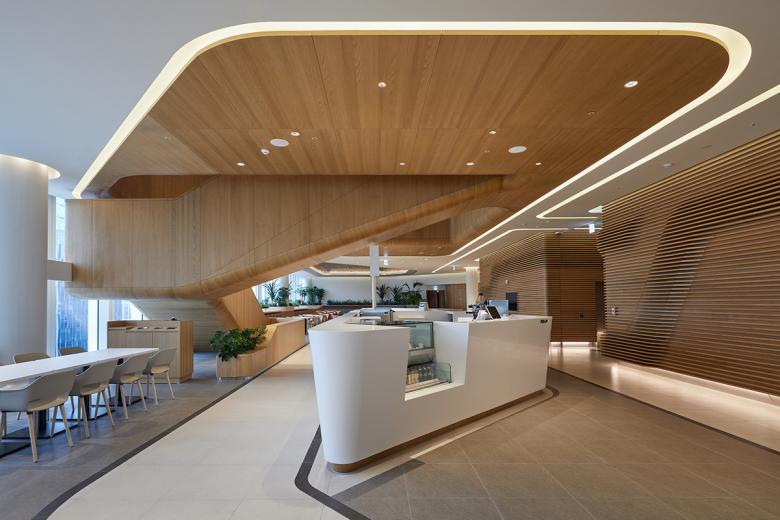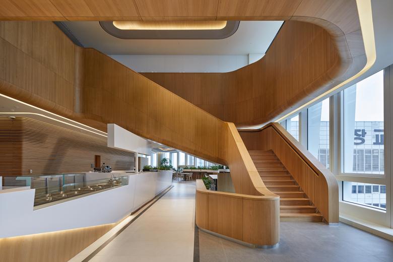 The collective spaces serve all the employees of Hanwha, bringing together the different departments and providing informal spaces for social gathering with high spatial and material qualities.