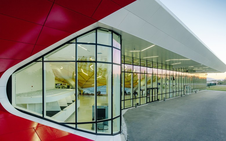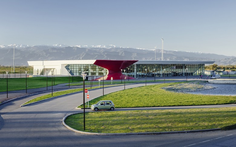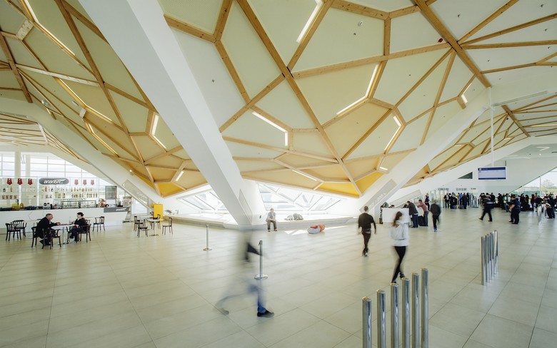 The new Kutaisi 'King David the Builder' International Airport - which serves domestic and international flights for use by tourists, national politicians and international diplomats - incorporates both Georgia’s historic landscape and its architecture. The architecture of the terminal refers to a pavilion; a gateway, in which a clear structural layout creates an all-encompassing and protective volume. The volume is structured around a central exterior space which is used for departing passengers. The transparent space around this central point is designed to ensure that flows of passengers are smooth and that departure and arrival flows do not coincide. Both the exterior corner detail and the so called 'umbrella' structure within the terminal building – which operates as a roundabout for passenger flows - operate as the two main architectural details around which all of the airport functions are organised.