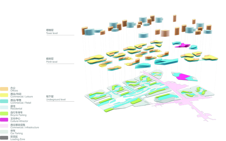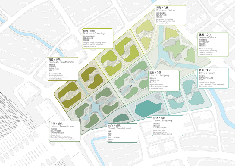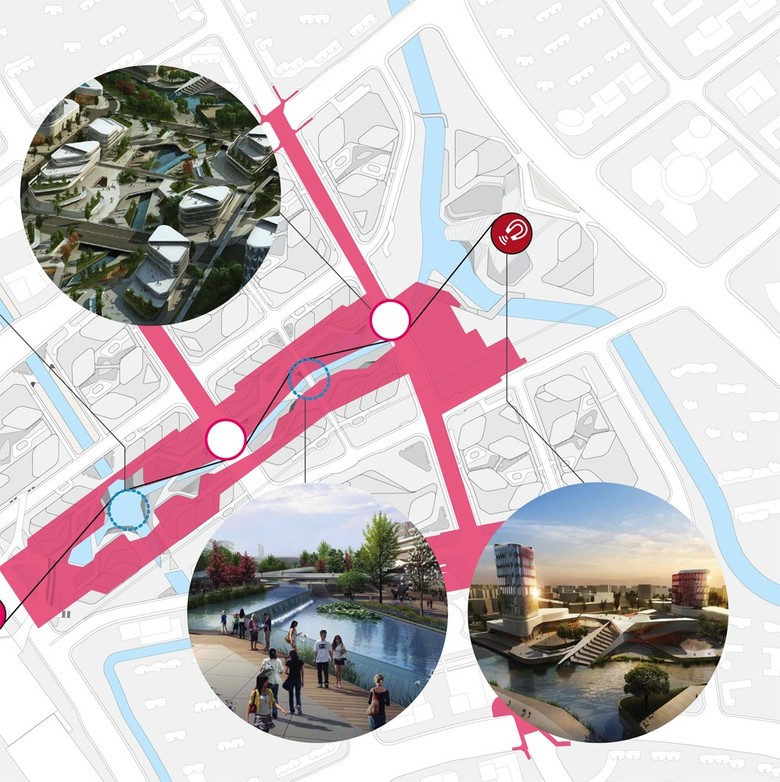 The design strategy for the Hangzhou New District pursues the idea of creating a green and lively pedestrian artery (above and below ground) as a means of connecting the main transportation hubs, main station and the metro station with the cultural attraction of the new Ecological National History Museum. The green pedestrian artery passes through a varied retail configuration; from restaurants, high-end retail outlets and public activities to the more local configurations of grocery stores and snack bars. The green design strategy aims to create a synergy between the environment and its users by offering spaces where high green density becomes a social and economical indicator for quality of life.