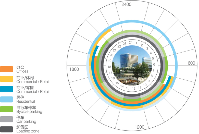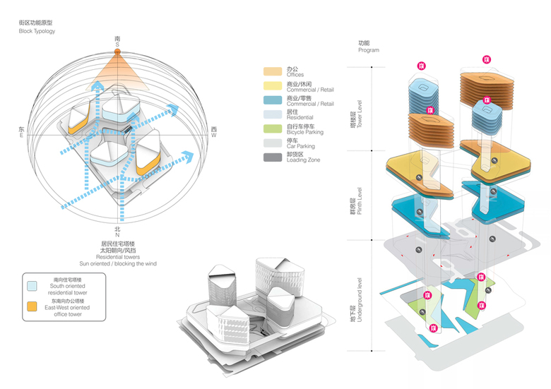 Heat Islands (cooling and warming wind effect) – Metropolitan zones are significantly warmer than their surrounding rural areas, mostly due to the extensive use of heat retaining materials in cities and the surplus heat generated by energy usage. The design for the Hangzhou New District aims to harvest this surplus energy by inducing air circulation within the pedestrian zones and thereby increasing user comfort. Wind corridors in low density areas will allow for better wind penetration, whilst the grouping of buildings reduces direct solar exposure. The addition of greenery further improves cooling effects for the central building complex. Temperature differences from the surroundings forces air circulation during periods of low wind, thereby reducing heat levels.