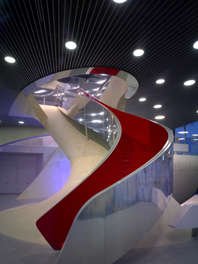 The building is structured to combine a unit-based volume (the black box of the theatre) and a series of movement-based volumes (foyer and public circulation). Because this organising principle is made constructive, a fluent internal spatial arrangement is actualised, efficiently connecting spaces to each other. The multipurpose auditorium can seat up to 450, and is adaptable to a great variety of performances. The free-flowing space of the foyer is made possible by a spiraling constructive element that connects the entrance to the auditorium and to the music rooms above, thus welding together ‘with a twist’ the three levels of this side of the building. This twist forms a 3D interpretation of the repetitive pattern, executed in the muted tones of stage make-up, which is applied to the facades and then enveloped by a glittering mesh.