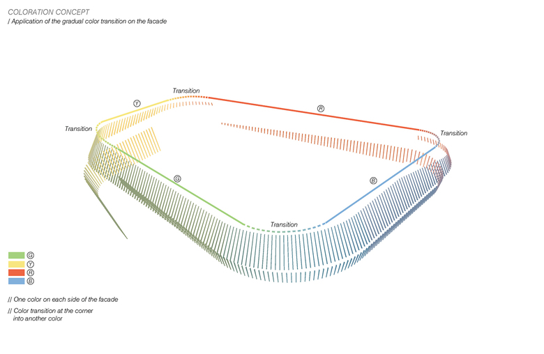 ‘Rainbow Ribbons’ provide the routing and infrastructure for the expo and permeate the surrounding landscape. This colour concept is further reflected in the facade elements which are constructed from vertically folded aluminium panels. The four theme colours (green, yellow, orange and blue) are applied along the lengths of the vertical folds, appearing and disappearing depending on the viewpoint.