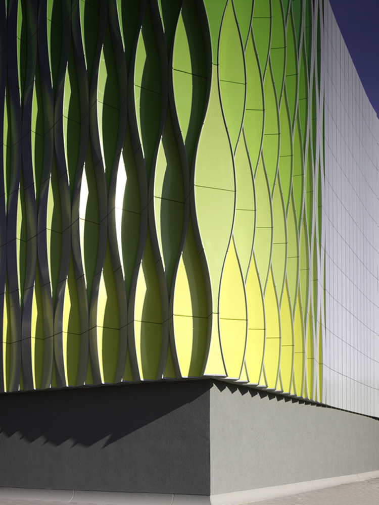 In response to this quandary, UNStudio has designed a deceptively simple envelope constructed from flat, vertical aluminum slats, which, in places, are twisted outwards in bowed forms. Thus, tall, vertical undulations are generated, which present an open or a closed aspect depending on the angle under which they are viewed. This optical effect enlivens the restrained facades, which is made even stronger by the application of bright colours to the flat surfaces that are created by twisting the aluminum slats sideways. On the lower level the colour yellow is used, which gradually changes to green towards the top of the building. The particular shade of green that was chosen reflects the public garden on the corner of the Oostersingel and the Antonius Deusinglaan opposite the building. Consequently, the laboratory, while minimizing or even prohibiting both the incursion of daylight and views into the building, still responds to its surroundings, offers some visual stimulus and, through the optical effects, presents a semblance of transparency.