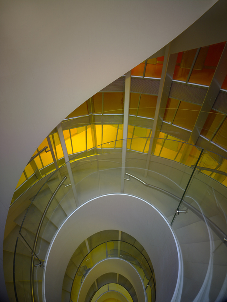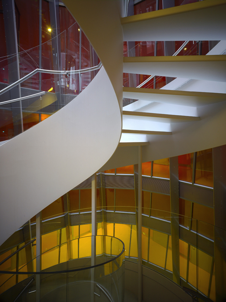 The activities within the Research Laboratory require the separation of four microbiological levels. At the lowest level are the supporting areas including the reception area, the administrative spaces on the second floor and the dispatch area on the ground floor. The laboratory areas are divided into three microbiological levels, each with its own accessibility grade and hygiene screening level. The main entrance to the research laboratory is on the second floor, where it is linked to the central walkways of the WMF building by a footbridge. On ground level there is an entrance where small transport vehicles can deliver and collect goods without causing interruption. The materials used in the design are chosen to comply with the requirements of a laboratory setting. Therefore a homogenous polyurethane floor and wall treatment is employed. The colours used in the laboratory spaces are chosen with regard to the requirements of the technical programs, whilst the use of colour in the central supporting areas is lively and bright. Walls and floors share the same colours. On the ground floor, where daylight is at its lowest, yellow is used. Per floor this colour then deepens through to orange and finally to red on the uppermost level.