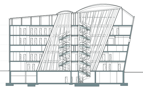 In the interior, two internal vertical voids allow daylight to enter the interior whilst ensuring that visibility from outside is avoided. These glass voids therefore function as a form of internal facade. By employing the voids, lift shafts and facade structure as constructive elements which ensure stability it becomes possible to create a mostly column-free space within these existing vertical supports. The two voids have the geometry of asymmetrical truncated cones which mirror each other vertically; so that where one has its wider end at skylight level, the other has its wider end at ground level. Shared walkways surround these internal voids, creating a clear organisation whereby dark corridor systems can be avoided. The individual laboratories are situated around the cones and are accessible directly from the shared walkways. This organisation turned out to be more efficient than the common laboratory organization with corridor systems, because of the reduction in the amount of circulation space.
