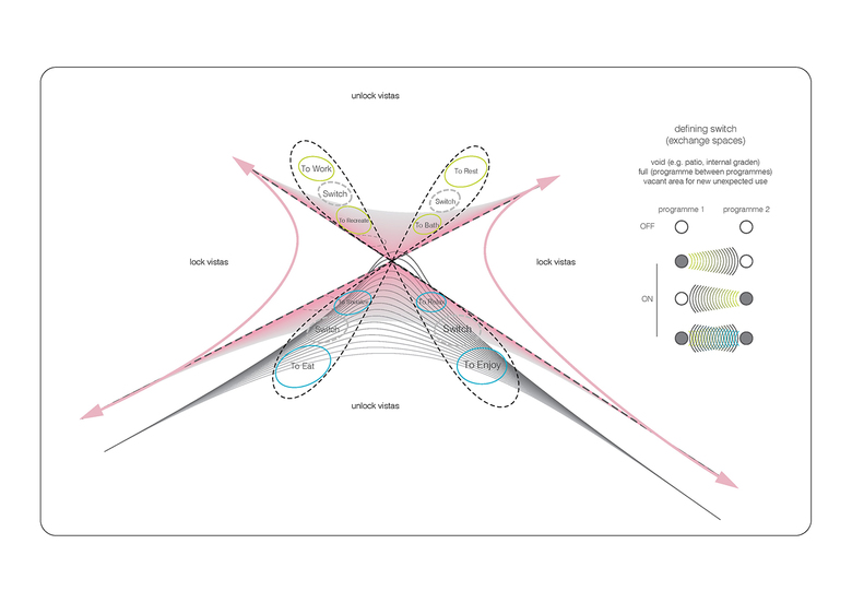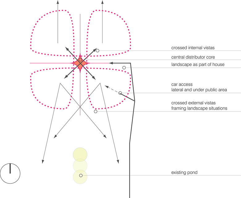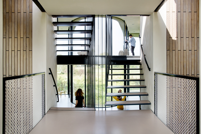 Centrifugal circulation – The vertical organisation of the building follows a centrifugal split-level principle. An open staircase at the centre of the house - which forms the circulation core between the four recesses - connects the front and back wings, with the result that each turn on the stair provides expansive vistas through the house and out towards the surrounding landscape.