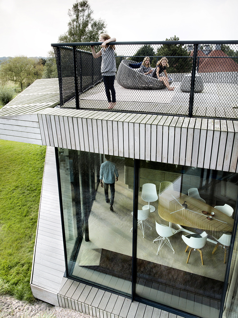 Assimilating the landscape – The organisation of the house is defined by its external conditions. The more intimate working and sleeping areas are located towards the back, where the enclosure of the nearby woods provides an intimate, private setting, while the living areas enjoy expansive and panoramic views of the polder landscape to the front.