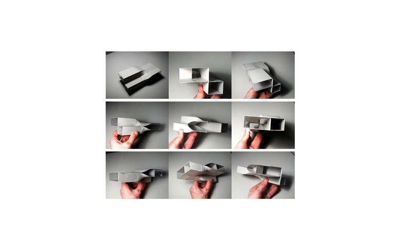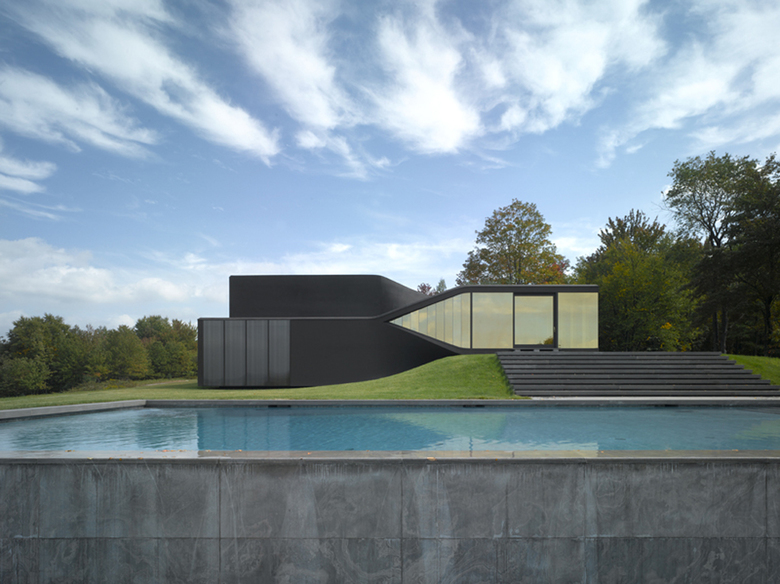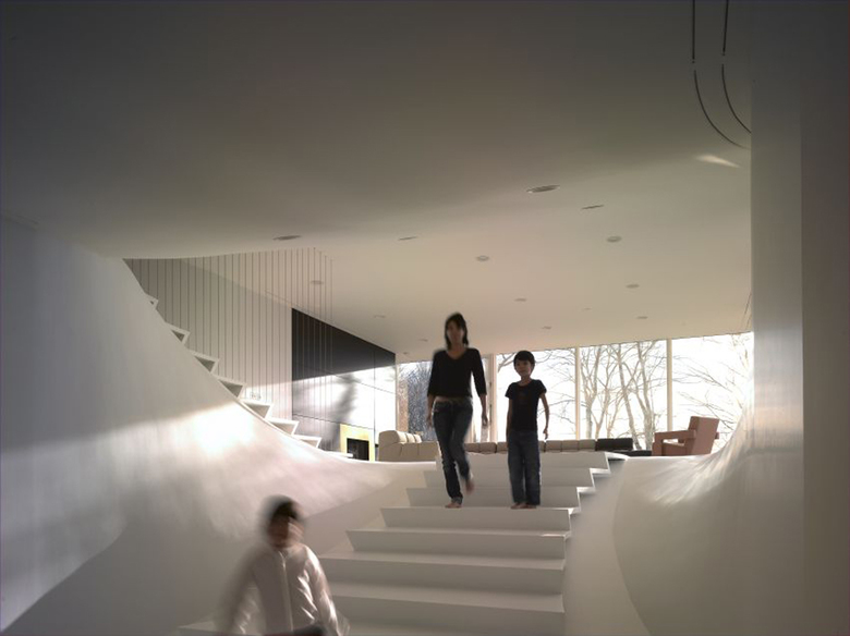 In the design for this single family house the sloping site is used as a device for programmatic and volumetric organization. A box-like volume bifurcates into two separate volumes; one seamlessly following the northern slope; the other lifted above the hill creating a covered parking space and generating a split-level internal organization. The volumetric transition is generated by a set of five parallel walls that rotate along a horizontal axis from vertical to horizontal. The ruled surface maintaining this transition is repeated five times in the building. From inside the huge window strips from floor to ceiling allow a fluid continuity between interior and landscape. From the exterior the reflective glass seams to become one with its surroundings.
