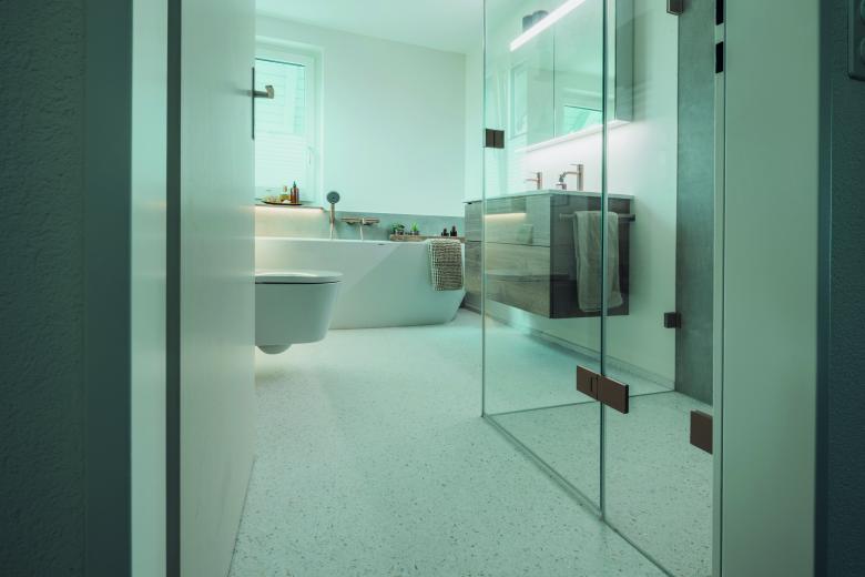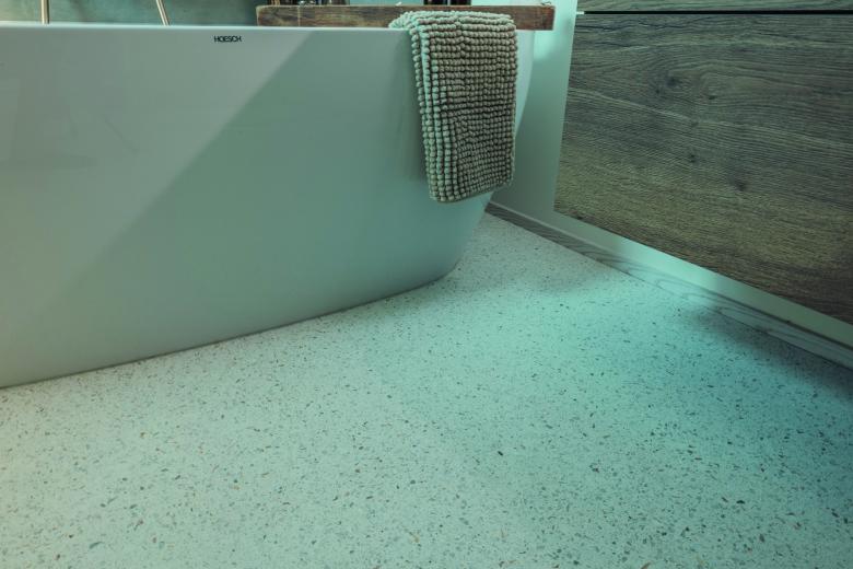 Aus unserer neuen NATURO – Linie hat sicher der Bauherr für unseren NATUROSTELLA® Bodenbelag im Badezimmer entschieden. Elegant, zeitlos und funktional, so lädt diese neue Oase zum Entspannen ein. Die helle Mischung, welche mit Muscheln besetzt ist, verleiht dem Belag eine warme Optik, fast wie am Strand.