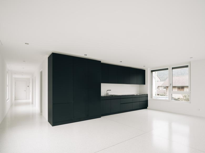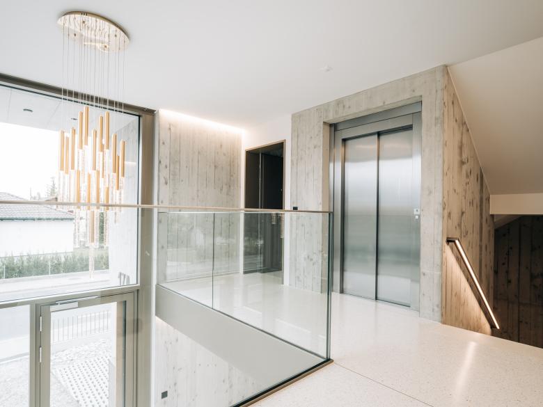 Auch hier konnten wir auf unser breites Bodenbelagssortiment zurückgreifen. Im Kellergeschoss bauten wir neben Dämmung und Unterlagsboden, unseren Haypanol® D Kunstharzbodenbelag, inklusive Hohlkehlsockel ein. In den darüberliegenden Geschossen einschliesslich dem Treppenhaus, wurden Dämmung, Unterlagsboden und als Endbelag unser SURFATEX® Terrazzo eingebracht. Dieser wurde mit feinkörnigem, weissem Marmor und Weisszement als Bindemittel ausgesucht. Für das gewisse Etwas wurde Perlmutt dazugefügt, dieser verleiht den Flächen, neben dem bunten Schillern je nach Lichteinfall, eine warme Note.