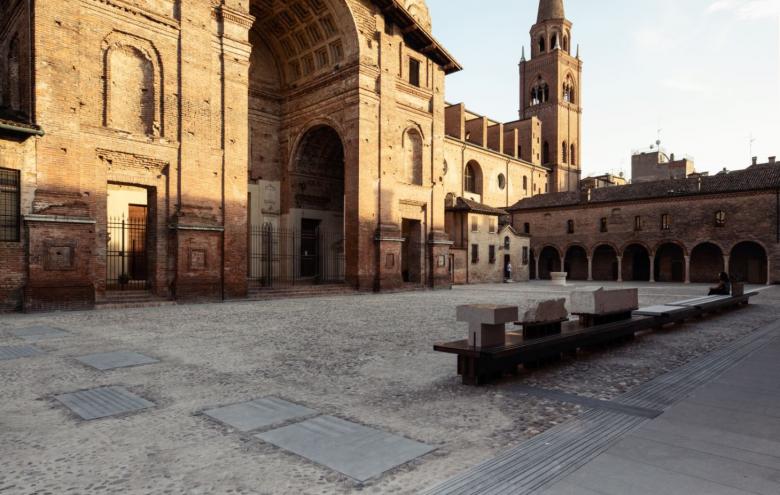 L'area sulla quale sorgeva il chiostro sarà ancora individuabile nella sua struttura geometrica grazie all'utilizzo di lastre di pietra bianca che definiscono il perimetro del chiostro porticato.