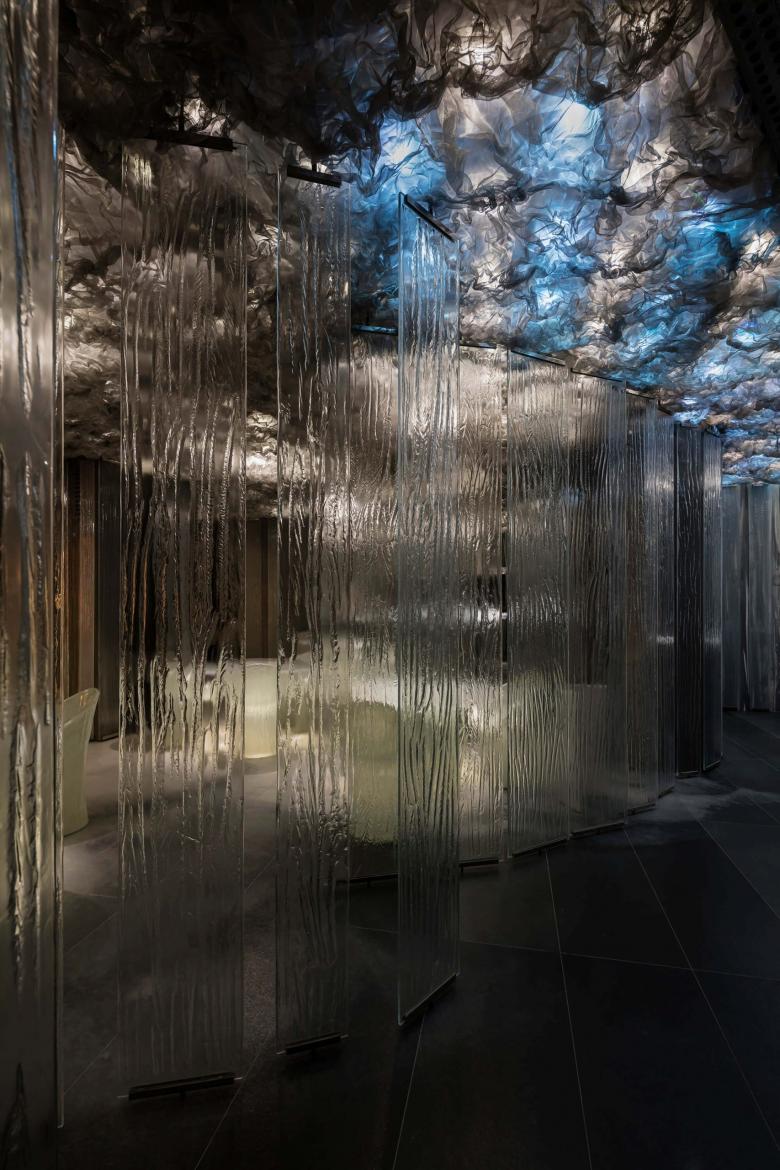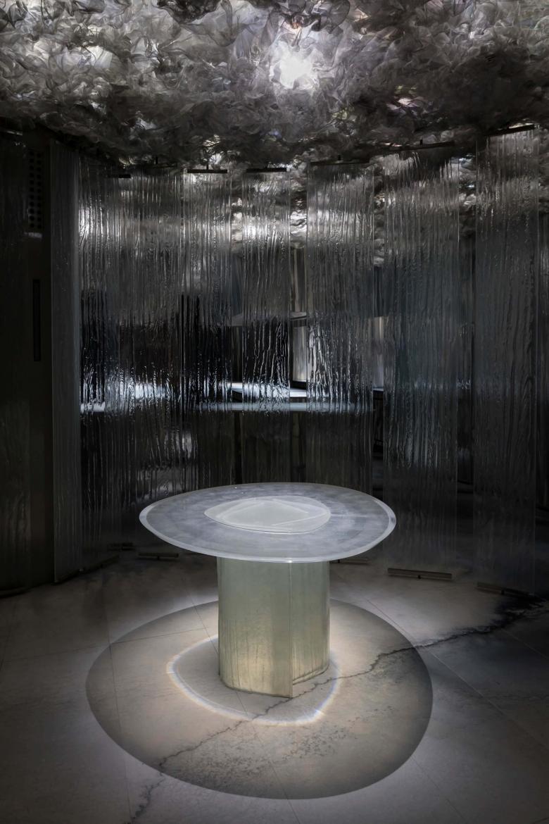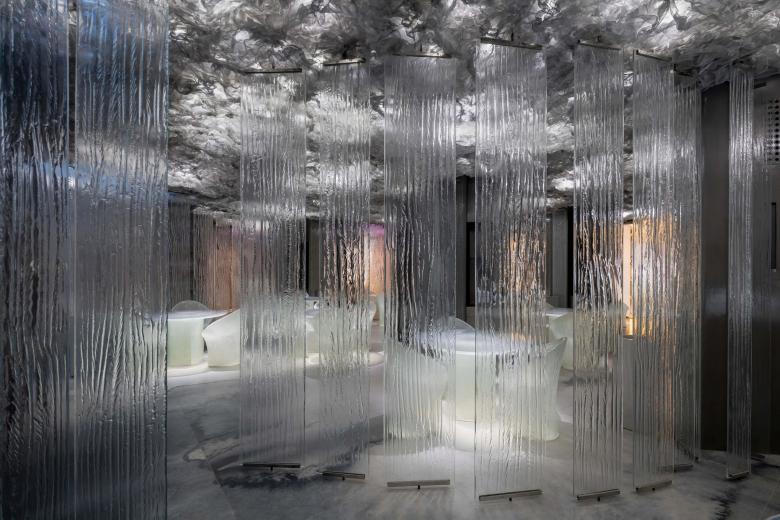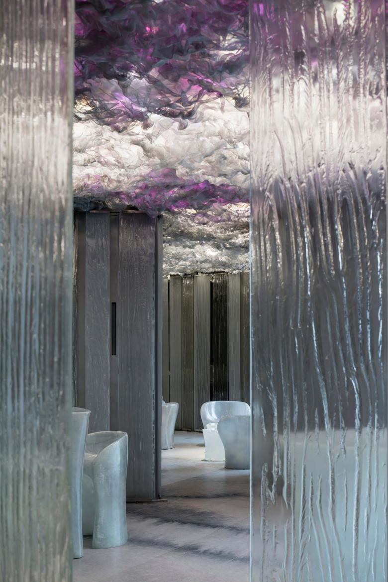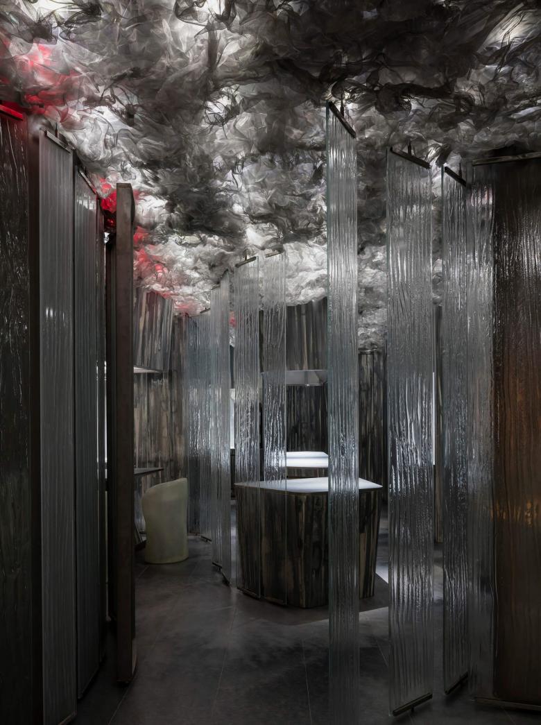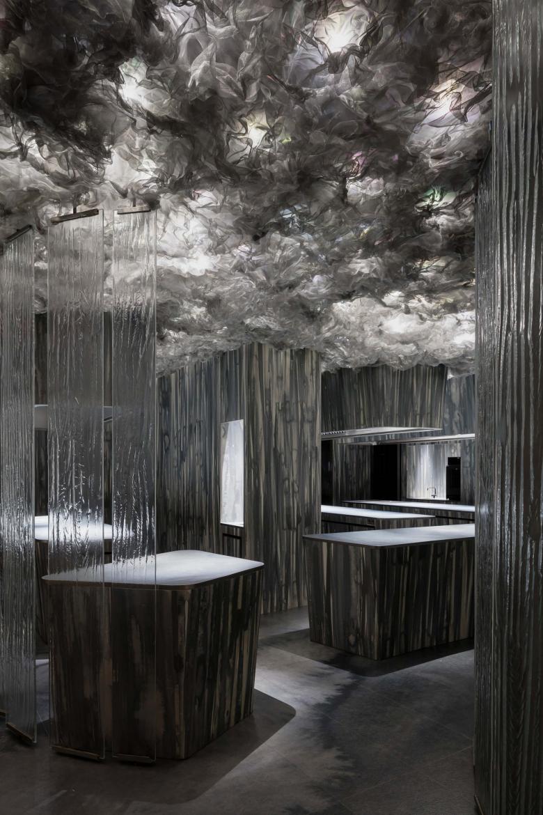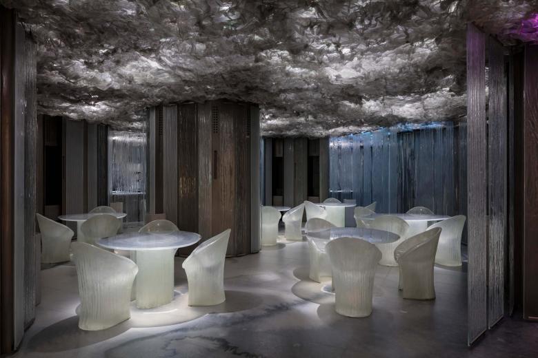 Architecture and illumination work together to this end: the undefined background, the transparent chairs and tables that reflect their surroundings. The luminous yet murky “cloud” that fills the restaurant and that submerges diners in an ethereal world through the use of vaporous materials and light. The color that sets the mood and introduces diners to the themed zones, generating chromatic compositions inside the cloud; the wine of the cava lounge, the ice of the cocktail lounge, the fire of the Teppanyaki lounge. The experience is served.