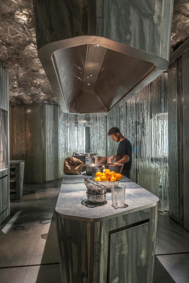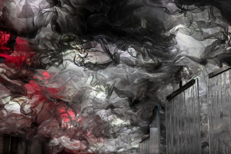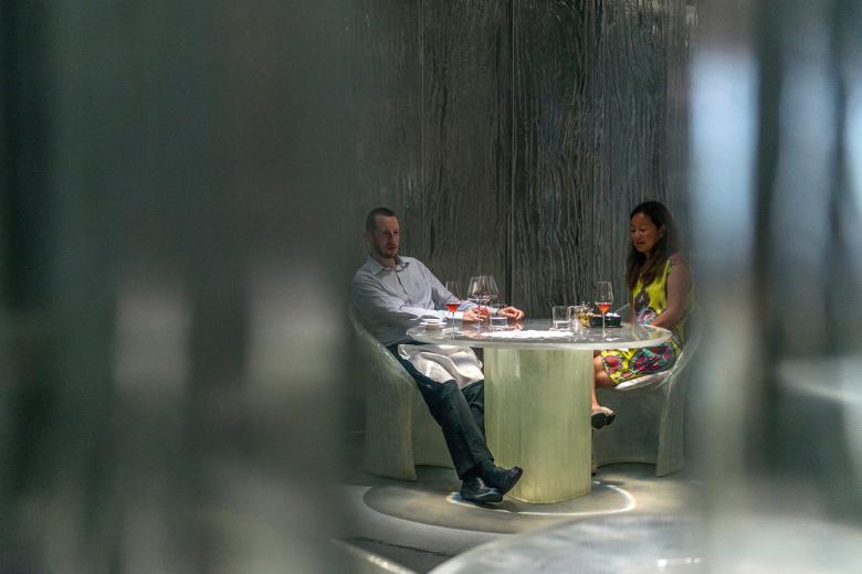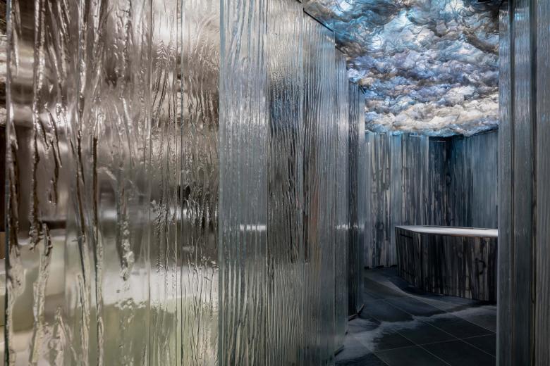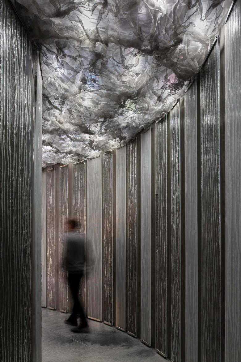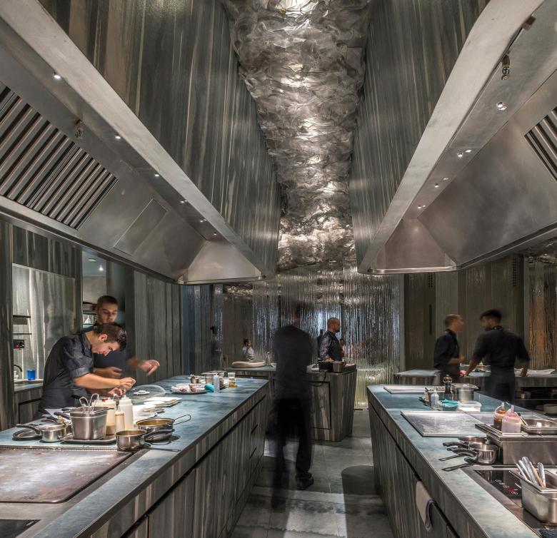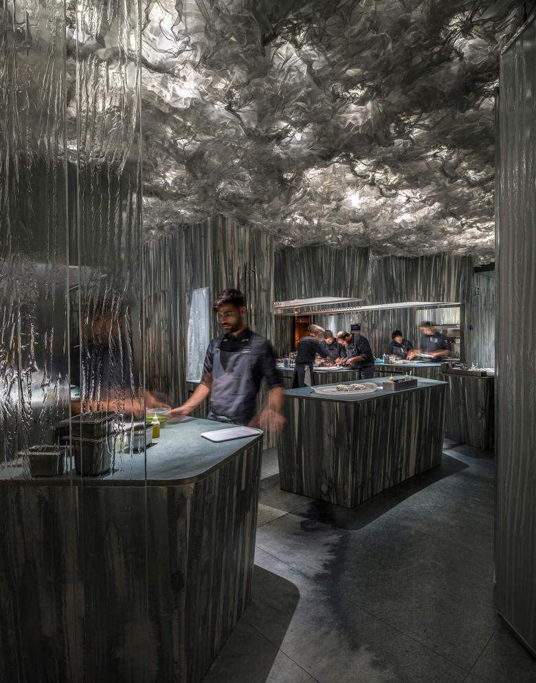 Architecture and illumination work together to this end: the undefined background, the transparent chairs and tables that reflect their surroundings. The luminous yet murky “cloud” that fills the restaurant and that submerges diners in an ethereal world through the use of vaporous materials and light. The color that sets the mood and introduces diners to the themed zones, generating chromatic compositions inside the cloud; the wine of the cava lounge, the ice of the cocktail lounge, the fire of the Teppanyaki lounge. The experience is served.