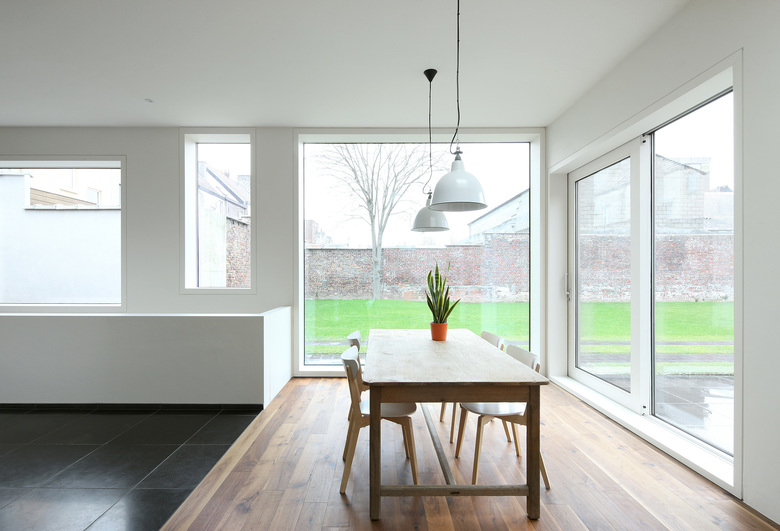 The rear structure of the terraced house was in poor condition. We replaced the structure with a new beam-shaped residential volume. A well-chosen composition of wooden windows and skylights provide the dwelling with light, sun and views. An underground storage enables us to create an open space which contains the living, cooking and dining activities. Furniture pieces subtly structure the layout of the residential volume. The strict rhythm of the windows on the upper floors in the front façade is continued on the ground floor. The shift of one window refers to the composition of windows in the new rear construction.