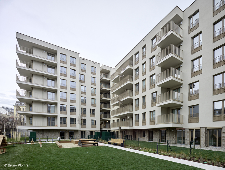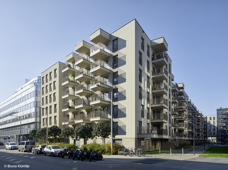 The urban development model "Waterfront Erdberger Lände" has been the guiding concept in creating a visible water’s edge as well as a connection of the residential district with the green areas of the Danube Canal and the Prater by a network of pathways.