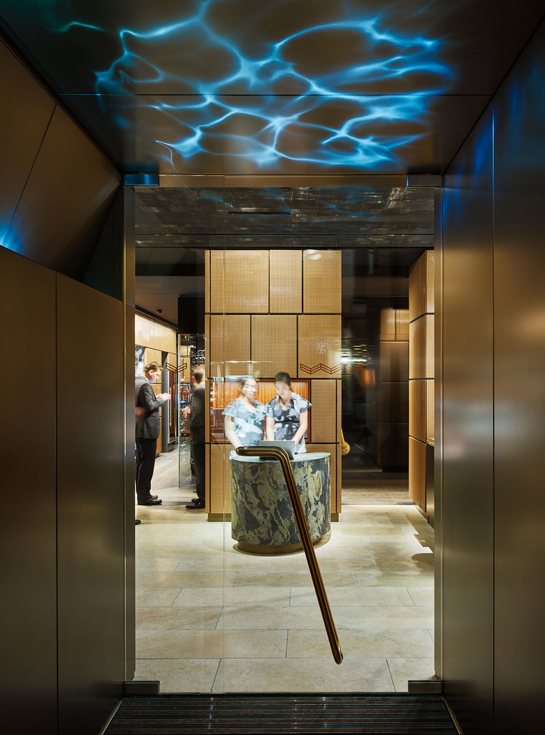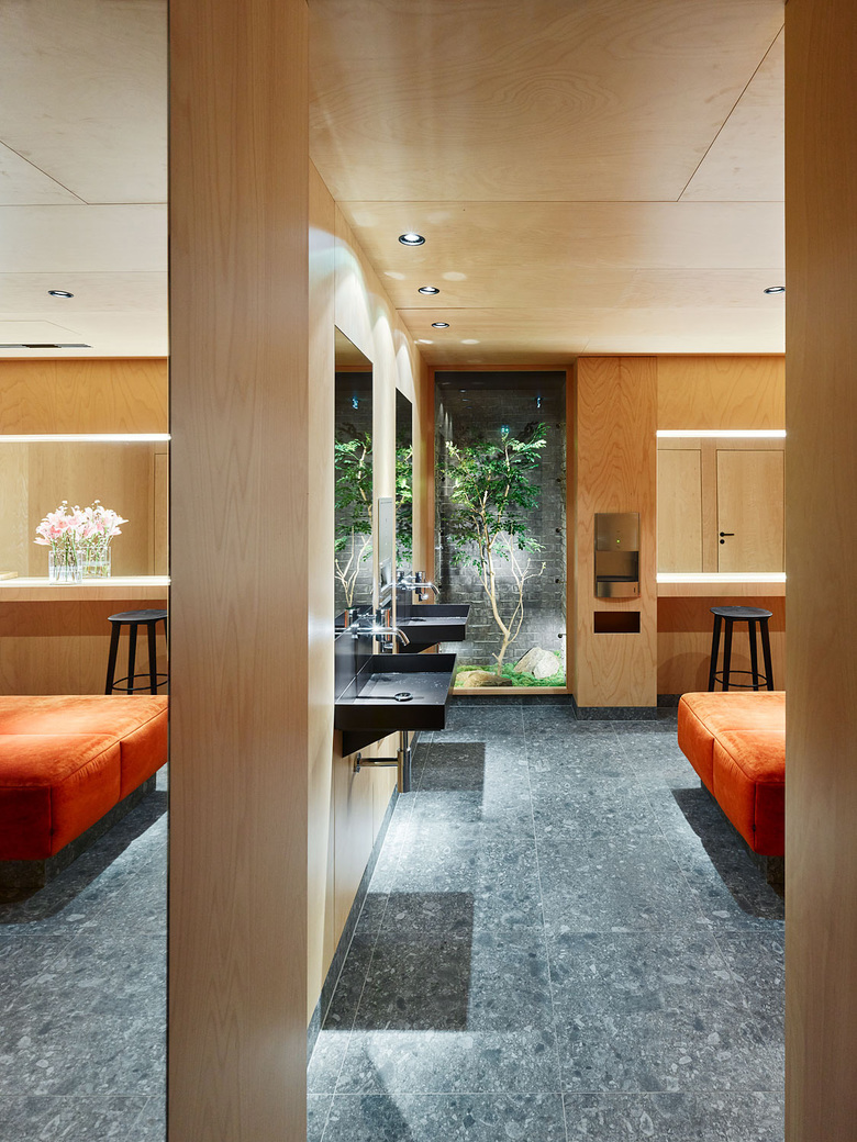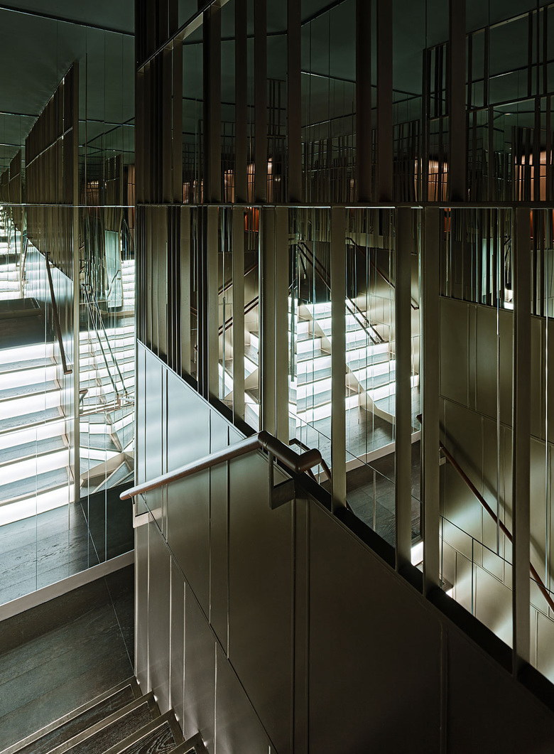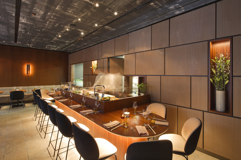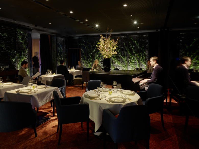 An L-shaped side hallway leads from here – past the Chef´s Table and an impressive wine cooler – to the Fine Dining area. Two neighbouring separees offer entrance to a Japanese garden. The production of these space sequences of discreetly mirroring lacquered walls, soft-mud, planted walls with effective shadow gaps behind a slender grid of bronze underline the emotional, sensual combination of different worlds, inner and outer, tradition and modernity. This architectural principle creates both an inviting, pleasant as well as a discreet and timeless atmosphere in which the guests may enjoy exquisite food and selected beverages.