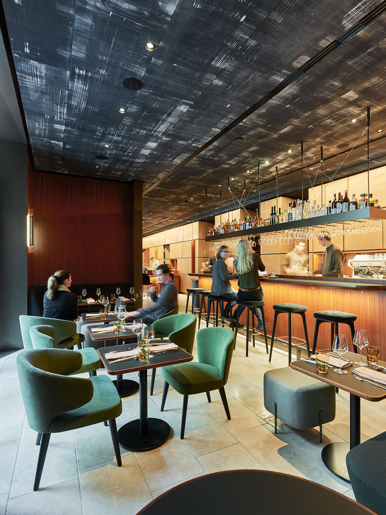 Using few puristic and high-quality materials, BEHF Architects creates spaces of sensual minimalism. Facilities of sustainable, clear mahogany wood, details of bronzed brass and handmade paper in continuously simple and clear shapes define a soft and elegant ambience of the 300 square meter guest area. It is split into an entree, a comfortable bar and brasserie, which mirrors the bright and wide kitchen area.