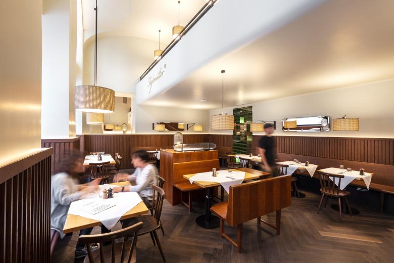 Diesmal ist es eine regelrechte Wiener Institution, derer sich BWM Architekten angenommen haben: Das legendäre Gasthaus Figlmüller in der Bäckerstraße Nummer sechs im ersten Wiener Gemeindebezirk. Das Lokal wurde einer Neugestaltung unterzogen und um eine ganze Hausnummer erweitert, womit es nun insgesamt 250 Gästen Platz bietet. Unter Touristen wie Einheimischen gilt der Figlmüller als erste Anlaufstelle für eine originale Wiener Küche, die sich der Tradition verpflichtet fühlt, dabei aber mit der Zeit geht. Genau so, wie sich jeder Küchenstil immerzu weiterentwickelt, zugleich aber verwurzelt bleibt in der Geschichte, vermittelt nun auch das Erscheinungsbild des Lokals ein Spannungsfeld zwischen Tradition und Innovation, zwischen Altem und Neuem.
