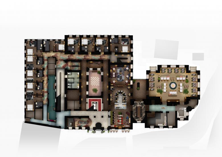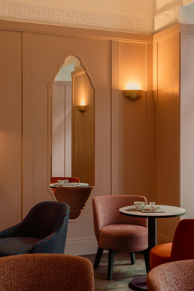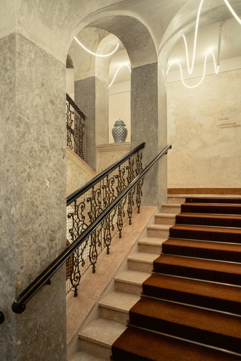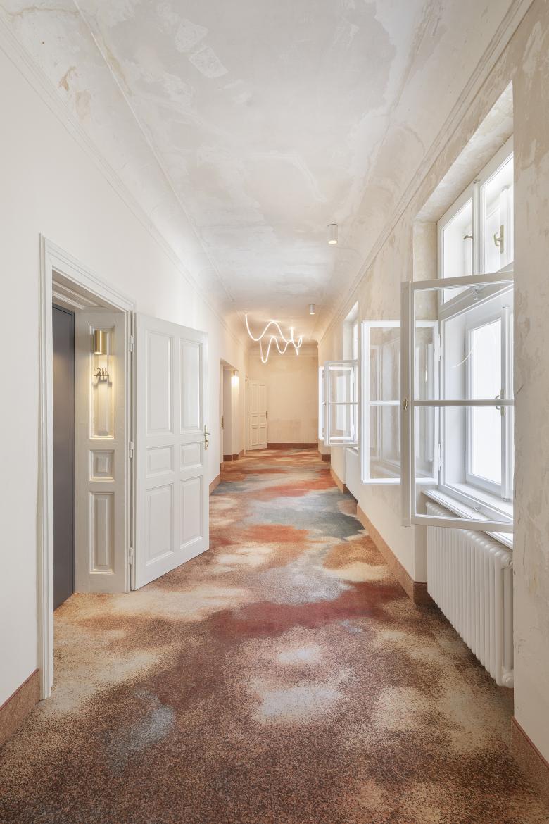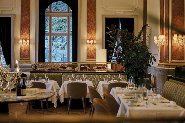 When guests enter the new Grand Hotel Straubinger, they are immediately captivated by the history of this venerable building. In the historical reception area, their room cards are handed to them from a velvet-lined drawer as if they were pieces of jewellery. The grand staircase that leads to the upper floors is straight ahead, while the F&B area is located to the right of it. The double doors of the café, which can seat 40 in total, give onto Straubingerplatz, where the outdoor seating directly on the square can accommodate 12 guests. The bar and the salon directly adjacent to the café provide the perfect setting for the end of day; the salon can be closed off with curtains as needed. In line with the principle of “working with the layers of the past”, all areas feature a contrasting mix of old and new, such as the combination of the existing wainscoting with modern, adapted wall panelling. “Depending on the time of day and how the respective areas are used, the furniture and colour scheme get progressively darker,” says BWM project manager Marlene Gesierich. The predominant colour used in the café is the modern shade “strawberry cream”. In the course of renovations, sage-green layers of paint were discovered beneath the old wall panelling in the salon and bar, inspiring the use of that same colour for the new look. And the Straubinger cake serving trolley is a nostalgic detail …