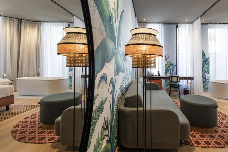 Das Konzept des Gartens setzt sich auch im gleichfalls reichlich begrünten Inneren des Boutique-Hotels fort. Ein Teil der Lobby ist ein Wintergarten, der vom Außengarten nur durch ausladende Fensterfronten getrennt ist, welche sich in der warmen Jahreszeit öffnen lassen. Unterschiedliche Bodenbeläge und Teppiche schaffen einzelne Zonen und Stimmungen. So sorgt etwa in der Bibliothek ein Parkettboden aus gebeizter Eiche für behagliches Ambiente, während ein roter Terrazzo-Boden aus Feinsteinzeug unter einer ovalen Theke den Bar-Bereich vom restlichen Raum abtrennt.