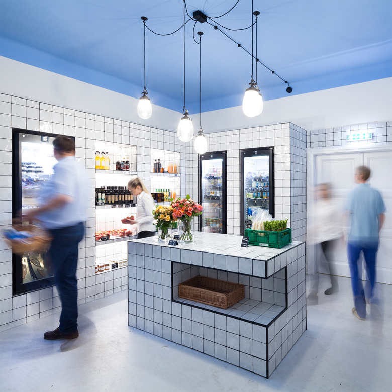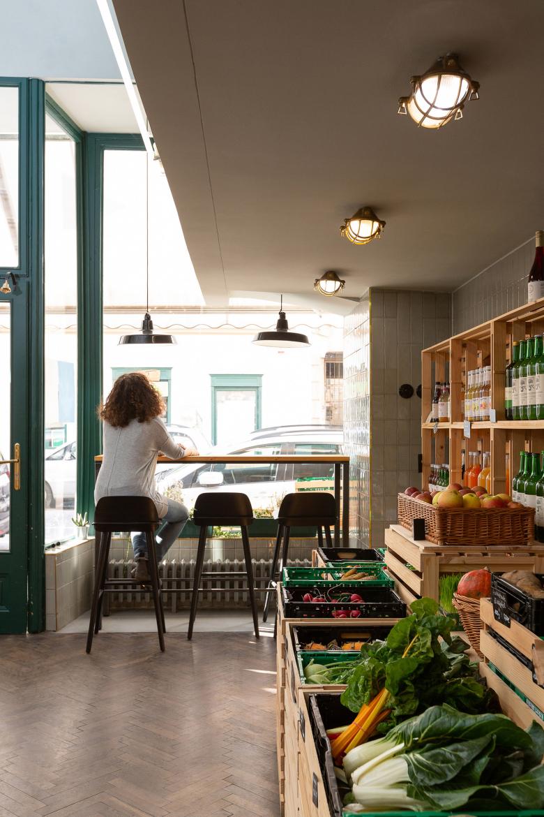 Vienna’s market gardeners produce fresh, seasonal fruit and vegetables every day. This flagship store, located close to the Naschmarkt in Vienna’s centre, aims to reinforce and promote their brand. The goods sold here are fresh products delivered daily by Vienna’s market gardeners and special baked goods and dairy products. The 120m2 shop is located in a historic listed building. The entire space is clad with tiles: crisp light green on the upper floor, and white in the dairy zone on the ground floor. A practical modular system made of light-brown wood crates is used for stacking the goods. This concept was developed by Neumann, a small Austrian company that creates ecological packaging solutions and whose customers include the Sacher Corporation.