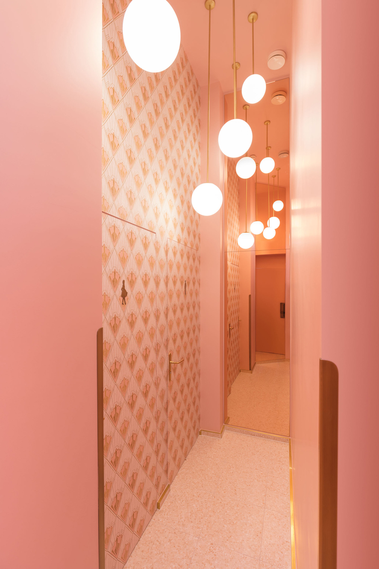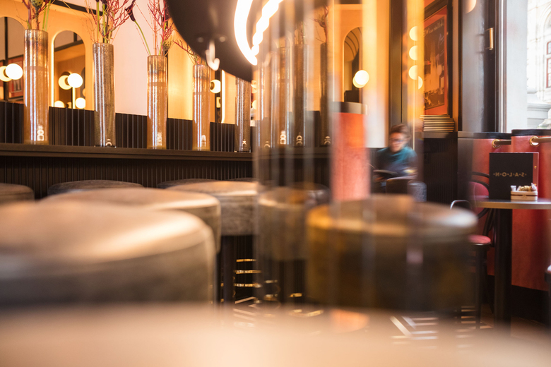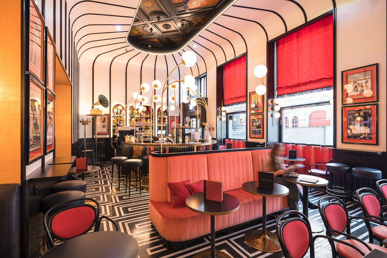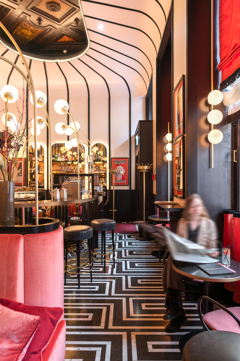 BWM Architekten haben nach dem Re-Design des Sacher Eck Ende 2017 auch die ehemalige Sacher Stube einer Neugestaltung unterzogen: Im Salon Sacher, so der neue Name, gehen die Farben Schwarz und Koralle ganz im Stile der 1920er- und 1950er-Jahre Hand in Hand. Gebogene Kugelleuchten setzen die Bar als Centerpiece in Szene, getönte Spiegel, schwarze Linien und metallische Effekte runden das Bild stimmig ab. Absoluter Hingucker ist eine erhaltene Stuckdecke – bis dato versteckt hinter dem Plafond, haben BWM diesem historischen Juwel mittels eines großen Deckenausschnitts wieder zu neuem Glanz verholfen.