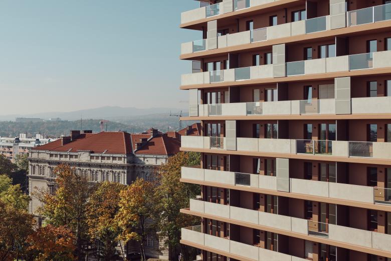 Das Gebäude auf Bauplatz 7 staffelt sich in gesamt sieben Geschosse, die dank eines durchgängigen Lichtbrunnens allesamt mit natürlichem Licht versorgt werden, und überdies freien Blick auf den Park und bis hin zur Gloriette in Schönbrunn bieten. Am Dach entstand eine 150m² große Gemeinschaftsterrasse mit schattenspendender Pergola, Urban Gardening-Zone mit großzügigen, automatisch bewässerten Hochbeeten sowie einer Indoor und einer Outdoor Küche, die den Bewohner:innen zur Verfügung steht. An der Fassade mischen sich farblich Ziegel- und Erdtöne mit hellem Putz, vorspringende Elemente setzen sich optisch deutlich von zurückspringenden ab. Innen wurde mit konträren Farben gearbeitet und so finden sich hier etwa grüne Wände oder blaue Fliesen. Das großzügige Stiegenhaus, ebenfalls in sattem Grün gehalten, wurde mit hochwertigen Materialien wie etwa Handläufen aus Eiche oder Stockwerksbeschriftung mit Metallbuchstaben bestückt.