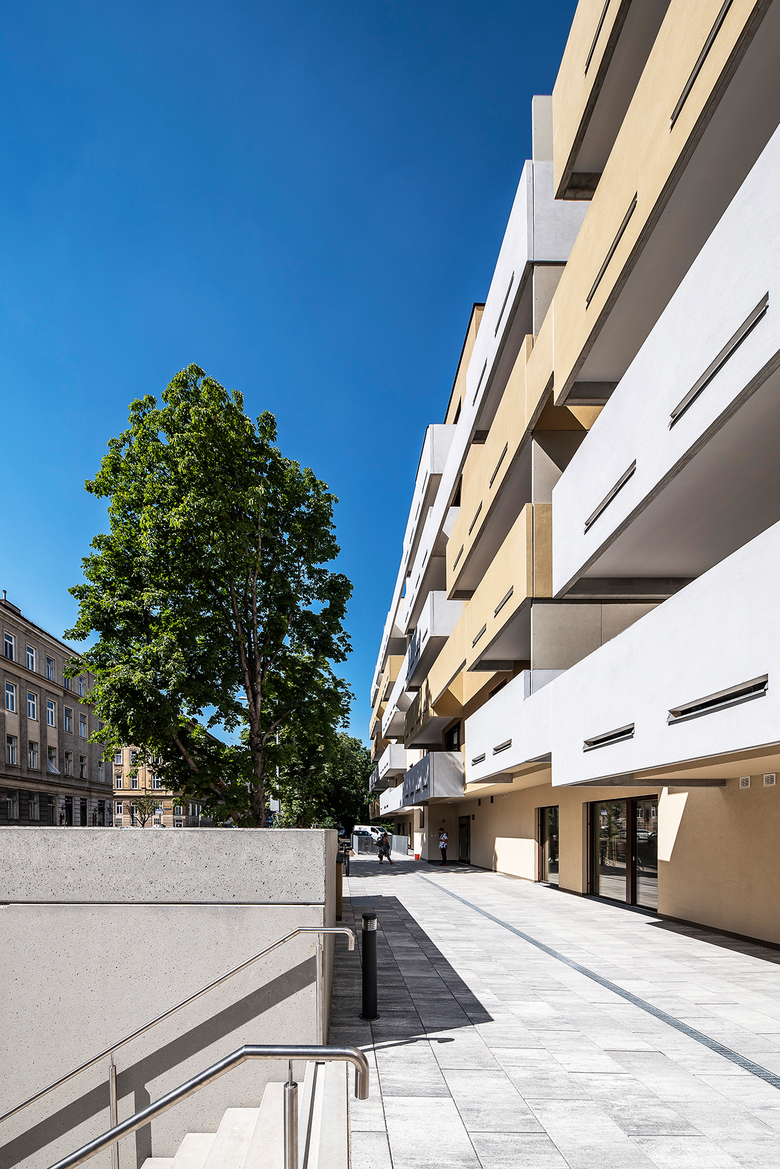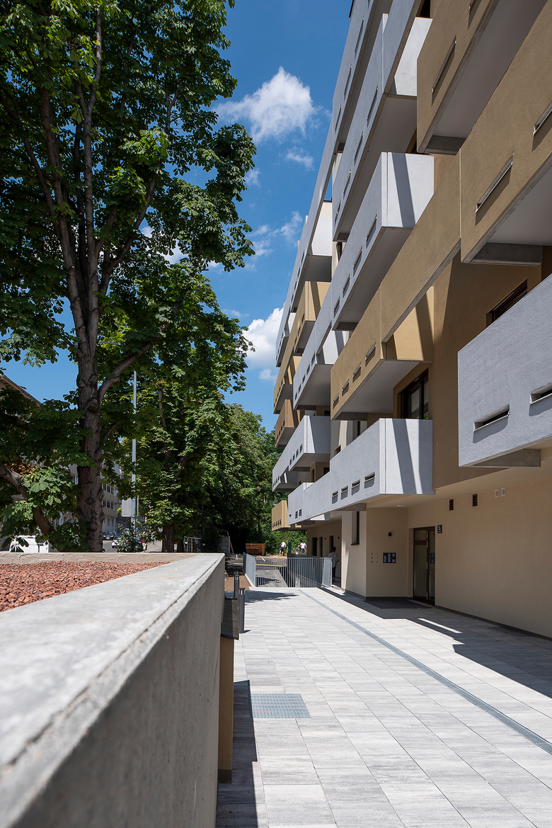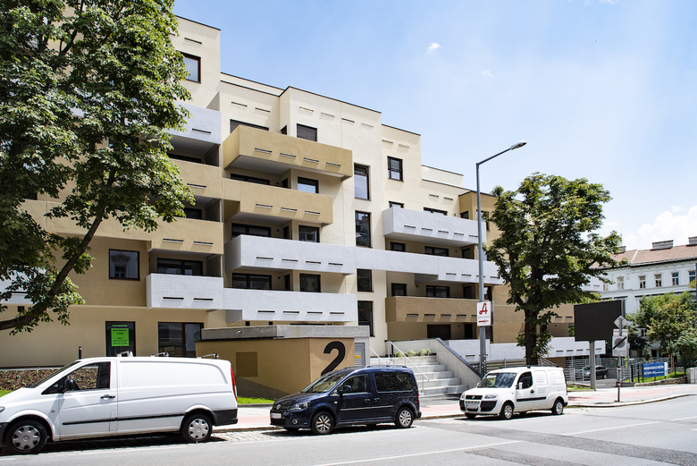 Planung und Errichtung eines Wohnbaus als „Terrassenhaus“ mit 80 Wohnungen auf sechs Stockwerken, einem integriertem Kindergarten und einer Polizeiinspektion. Das Gebäude mit der luftigen Betonfassade verfügt über eine hervorragende Infrastruktur und ist sehr gut an die Umgebung angebunden.