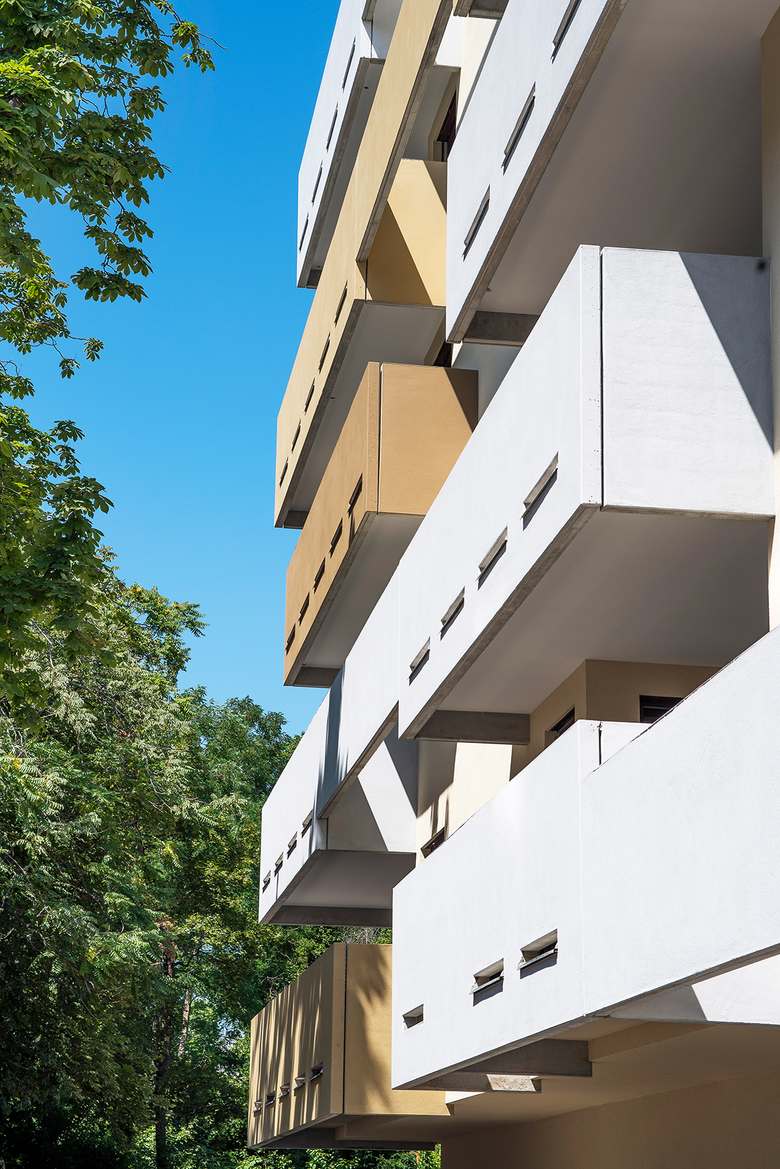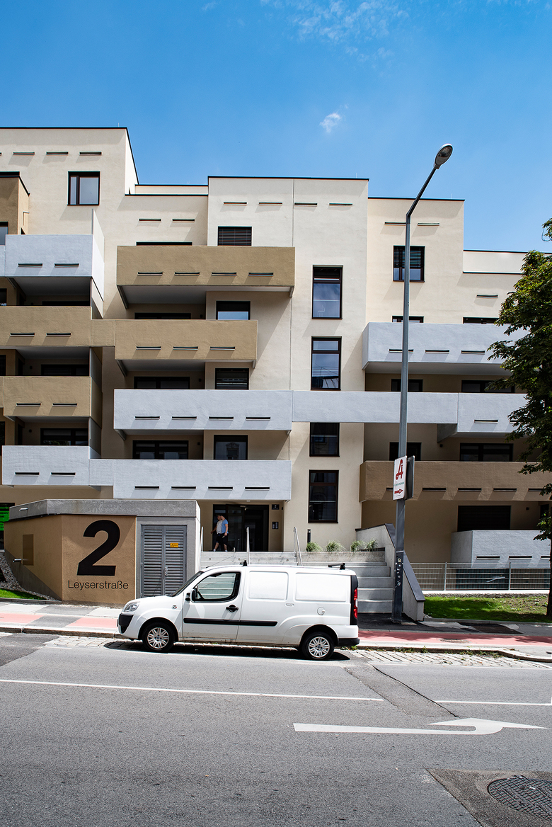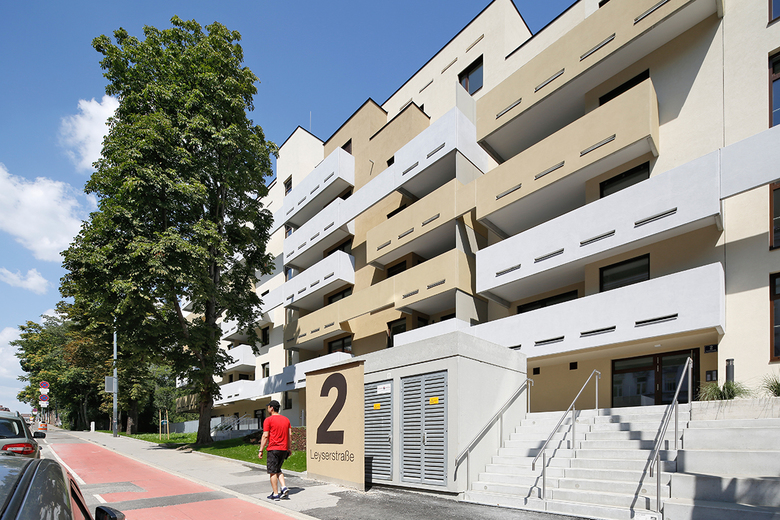 Die Balkone aus verschiedenfarbig lasiertem Sichtbeton umrahmen den gesamten Gebäudekomplex und verleihen dem Terrassenhaus durch die starke lineare Anordnung sein markantes Aussehen. Nadelstreifartige horizontale Schlitze dienen der Entwässerung der Balkone und erzeugen gleichsam eine Leichtigkeit. Der gewachsene Baumbestand an der Leyserstraße konnte durch umsichtige Maßnahmen erhalten bleiben und trägt zur Steigerung der Wohnqualität des Wohnbaus bei.