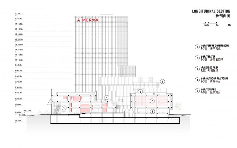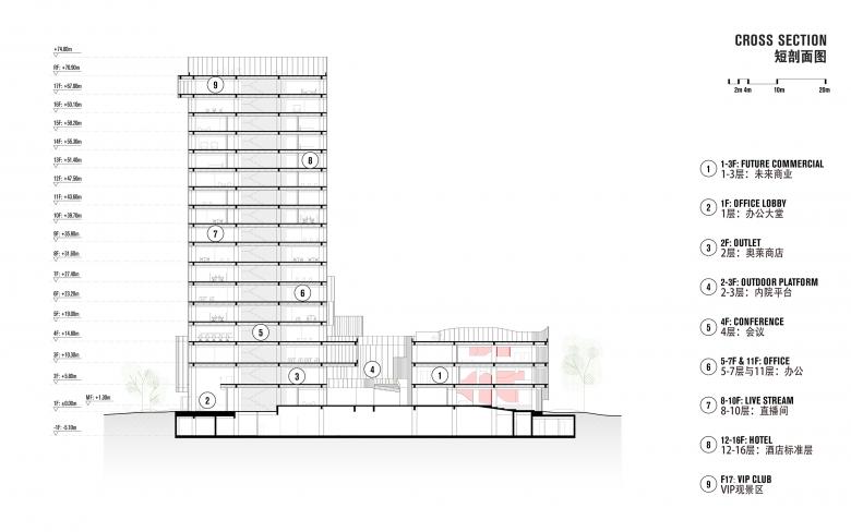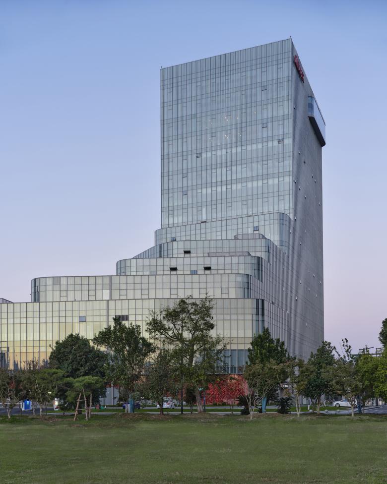 The Aimer Suzhou Headquarters integrates a diverse range of functions. The combination of Commercial areas, outlet, offices, live streaming, hotel, conference functions, multifunctional hall, and VIP reception, complete a building that caters to business travelers, shoppers, and creative professionals alike.