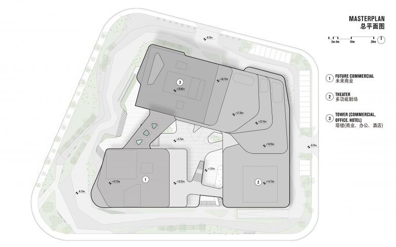 The original fragmented layout was reorganized into an integrated, multifunctional space, which enhances connectivity and program diversity. The redesigned complex consists of three interconnected volumes anchored by a 17-story tower. On the lower floors, the tower extends outward and gradually steps down into terraces, visually connecting the architecture to its surroundings.