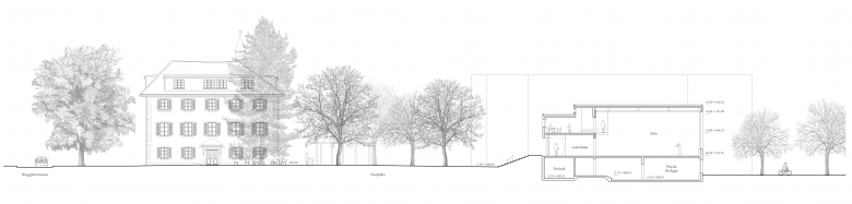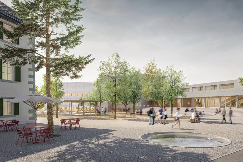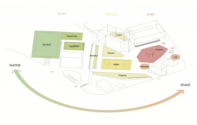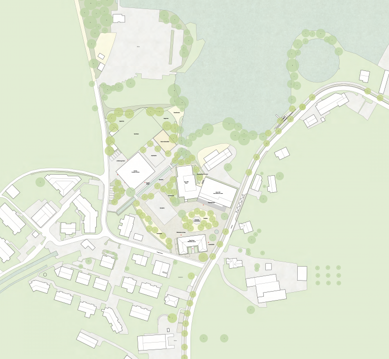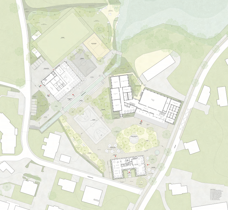 Neuformulierung der Schulanlage und eine neue Identität, Zugang zum See, Dorf- und Schulplatz, Sanierung der bestehenden Gebäude, Erweiterungsbau