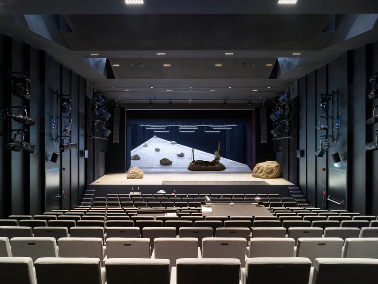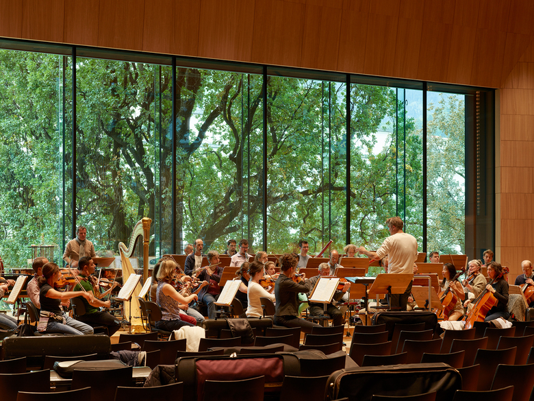 Der strenge Kubus ist durch Lichthöfe und eingeschnittene Loggien, Terrassen und Rücksprünge plastisch gegliedert und fügt sich feinfühlig und doch spannungsvoll in das Stadtgefüge ein. Die Architektur erweist den historischen Nachbarbauten Respekt und schafft gleichzeitig ein zeitgemäßes, kommunikatives, demokratisches Gebäude. Durch die transparente Sockelzone, das zum Platz orientierte Foyer und den offenen Bühnenbereich des Großen Saales im Obergeschoss verschwimmen die Grenzen zwischen Innen und Außen. Der große Konzertsaal mit seiner Glasfassade wird zur Freiluftbühne und der Eingangsbereich zum Auditorium.