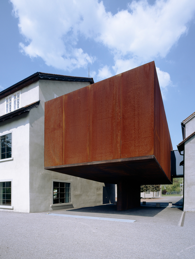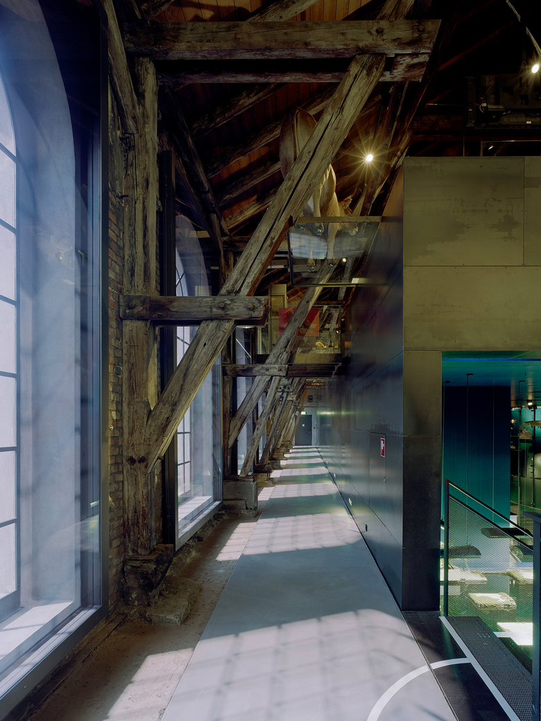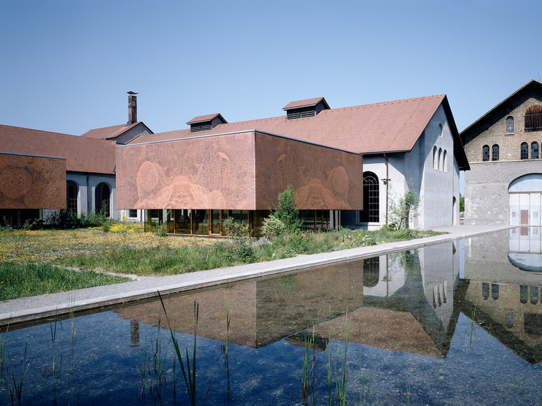 Die Innengestaltung nutzt die großen Räume, ist aber auf mehreren Ebenen eigenständig organisiert. Ein neues Verbindungselement wurde hoch aufgestelzt und mit vorgerosteten Stahlplatten verkleidet, so wie auch das Biomasseheizwerk an der Stirnseite der ehemaligen Dreherei. Zwei neue Baukörper im rückseitigen Hof beinhalten Büros und sind über einen Gang an die alten Hallentrakte gekoppelt. Das über das verglaste Erdgeschoss vorkragende Obergeschoss ist rundum mit einer textilen Hülle bespannt. Das aufgedruckte Muster, stark vergrößerte Aufnahmen von Rost und Flechten, tritt in einen subtilen Dialog mit seiner Umgebung und verschmilzt zugleich mit den Stahlplatten.