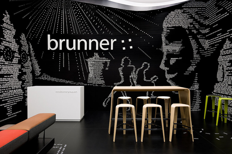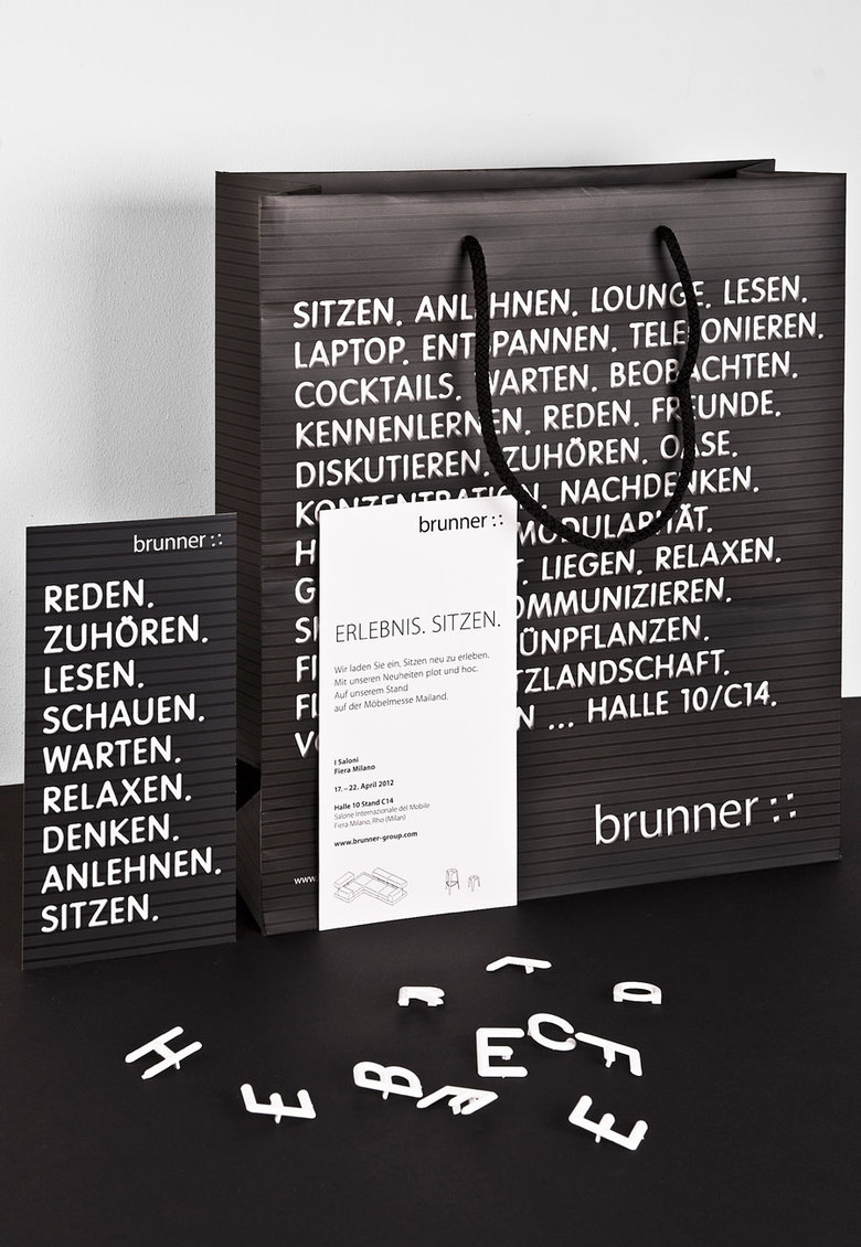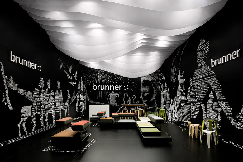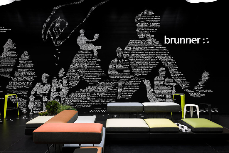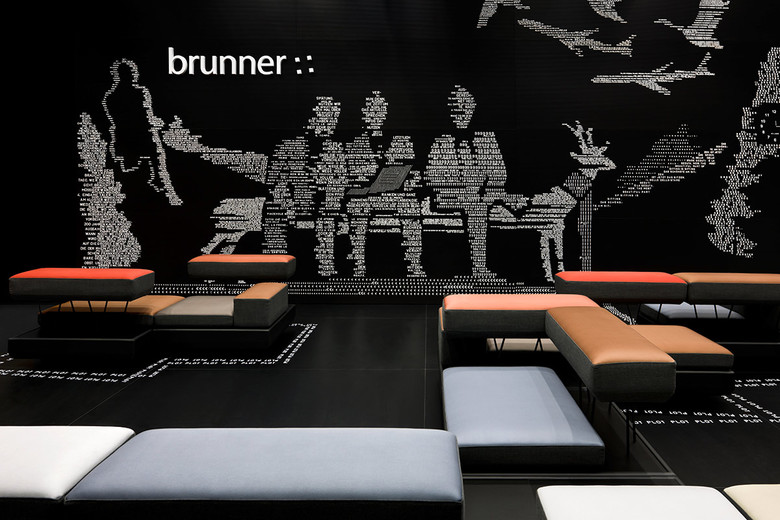 Die Mailänder Möbelmesse 2012 nutzt Brunner für die Vorstellung zweier neuer Produkte: des Hockers „hoc“ und des modularen Sitzsystems „plot“. Erneut wurde von der Ippolito Fleitz Group ein Raum geschaffen, der an eine Installation erinnert, und die neuen Möbel von Brunner in einem intensiven Raumerlebnis präsentiert. Ganz in Schwarz und Weiß gehalten nimmt sich die Umgebung aus der Ferne zugunsten der farbigen Sitzobjekte zurück, die so zum Ausprobieren einladen. Aus der Nähe betrachtet wird der Hintergrund zur poetischen Entdeckungsreise durch eine Textwelt, die den Besucher zum langen Verweilen animiert.