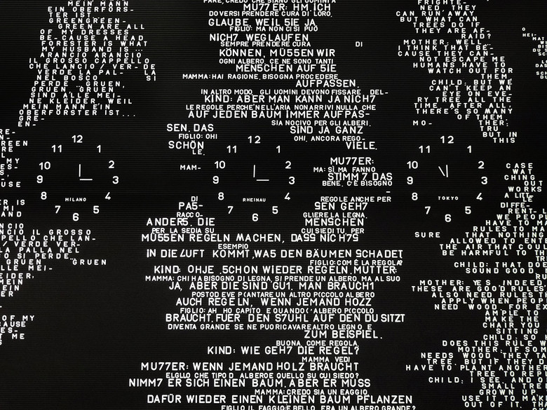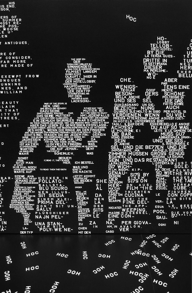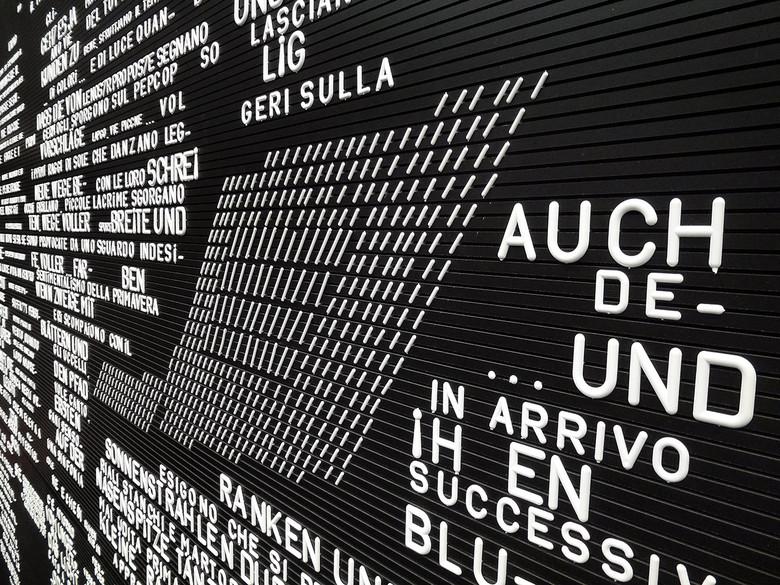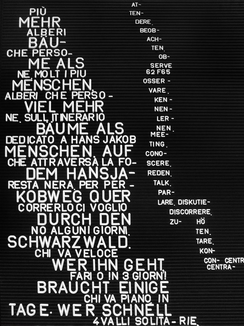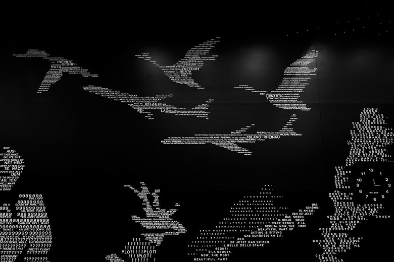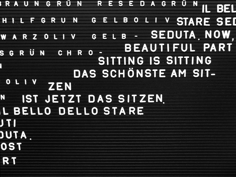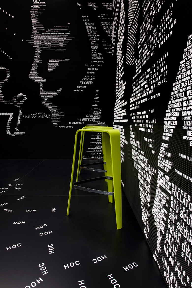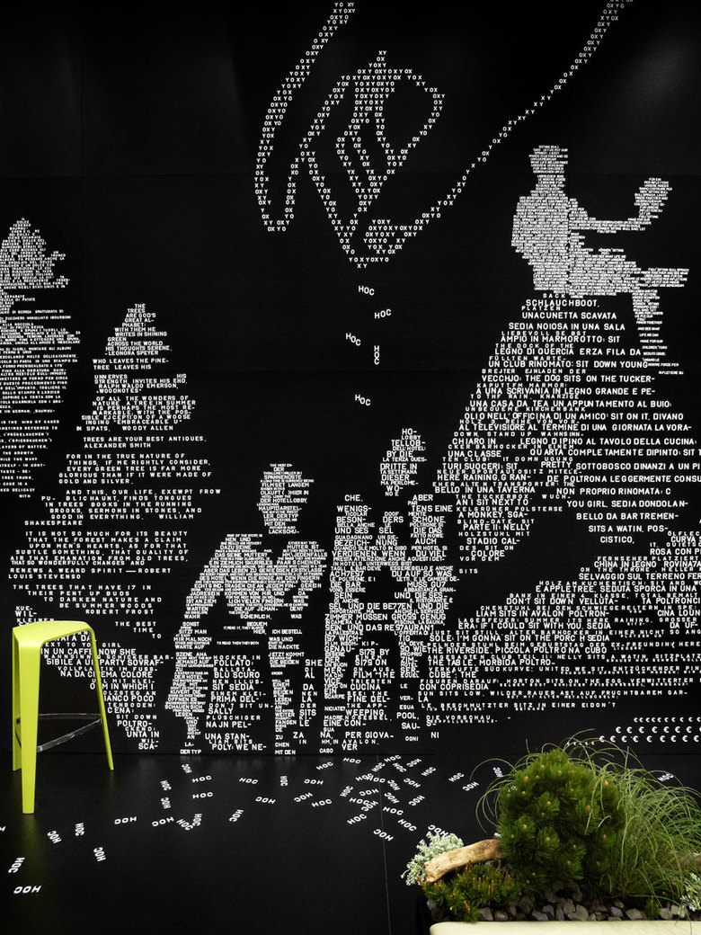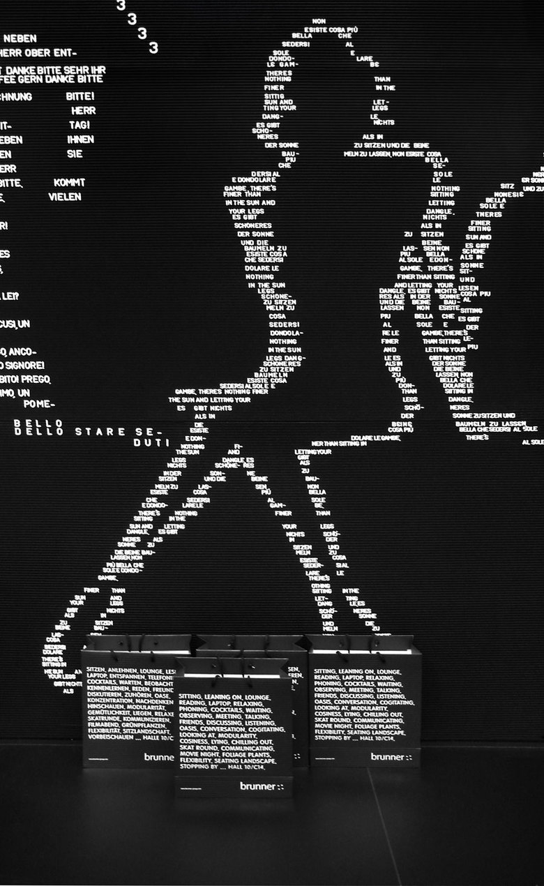 Genau diese Momente, Ereignisse, Gefühle spiegeln die umgebenden Wände wider. Der simple rechteckige Raum ist vollständig belegt mit einer Installation aus 54.000 Steckbuchstaben wie man sie von guten alten, fast verdrängten Informationstafeln aus Hotellobbys, italienischen Bars, Flughäfen, Bahnhöfen oder Konferenzsälen kennt. Weiße gesteckte Buchstaben auf schwarz gerilltem Grund bilden faszinierende assoziative Figuren, Szenarien, öffnen gedankliche Welten. Einige Motive verweisen auf die Heimat des Unternehmens im Schwarzwald, andere auf das Thema des Sitzens. Tritt man näher, lösen sich aus diesen Bildern Texte in deutscher, englischer und italienischer Sprache – eine Reminiszenz an die Konkrete Poesie. Beim Lesen entdeckt man in ihnen die Produktbeschreibungen der beiden Sitzmöbel, aber auch Dialogsequenzen, Songtexte, Zitate oder fragende Gedanken, die sich mit dem Thema Sitzen beschäftigen. Ironisch löst sich der eine Produktname aus dem Schal eines Hirschs, der andere purzelt aus der Hand Gottes. Der Strom ihrer Wörter setzt sich auf dem Boden fort, wo er die realen Objekte umschließt. Über der gesamten Szenerie schwebt ein hell leuchtender Wolkenhimmel aus konturengeschnittenen Textillamellen. So eröffnen sich phantasievolle gedankliche Welten, die das Ausprobieren einer Produktneuheit auf einer Messe in das kontemplative Genießen eines Moments der Entspannung verwandeln.