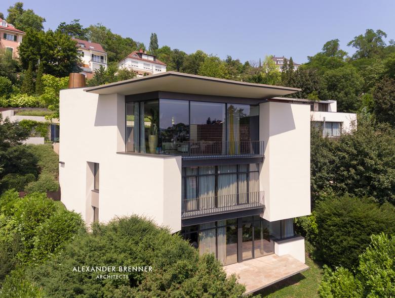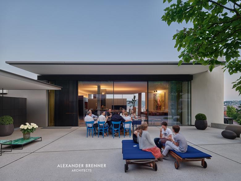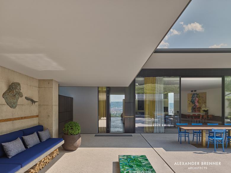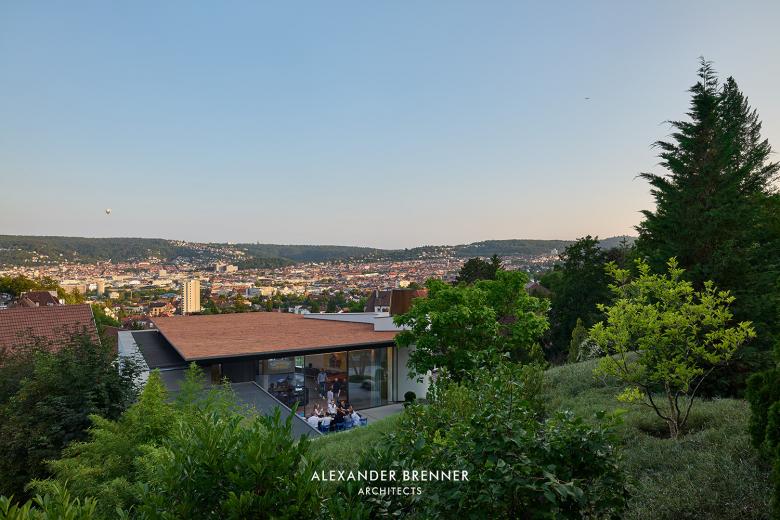 Die Topographie des Grundstücks hat Einfluss auf die Gestaltung des Hauses. Der Zugang zur 10 m tiefer gelegenen Wohnebene erfolgt über einen Fußweg parallel zum Hang oder über einen Autoaufzug. Dieser führt direkt in eine Alltagsgarage und von dort zu einem Ausstellungsraum mit der Oldtimer-Sammlung des Bauherrn. Beide Gebäudevolumen sind mit einem Gründach bedeckt, um die sichtbare überbaute Fläche so gering wie möglich zu halten und die Integration in die umgebende Landschaft zu fördern. Das eigentliche Wohnhaus liegt gegenüber und ist über eine Terrasse mit der Garage verbunden. Die Terrasse dient in den Sommermonaten als erweitertes Wohnzimmer im Freien und schließt direkt an einen offenen Wohn-, Koch- und Essraum im Inneren an. Ein Geschoss tiefer befinden sich die privaten Schlafräume und Bäder, während eine weitere Etage darunter einen freien Raum für verschiedene Nutzungen sowie ein Gäste-Apartment beherbergt. Von allen Etagen aus bietet sich ein wunderbarer Blick auf die Innenstadt und die gegenüberliegenden Hänge.