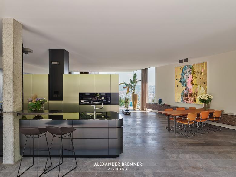 Das Interior Design spiegelt den modernen, minimalistischen Stil wider, der das Gebäude prägt, und setzt auf eine warme, einladende Atmosphäre. Durch die Verwendung hochwertiger Materialien und die präzise Gestaltung von Details entsteht ein harmonisches Zusammenspiel von Form und Funktion. Bei der Materialwahl legten die Planer/innen von Alexander Brenner Architektur besonderen Wert auf Natürlichkeit und Langlebigkeit. So wurden für die Böden im gesamten Haus Natursteinplatten verwendet. Der Einsatz von Eiche, rohem Stahl und Leder bei Einbauten und Mobiliar verleihen den Räumen eine angenehme Atmosphäre und strahlen zugleich Wärme aus. Kunst und Design sind integrale Bestandteile des Interieurs. An den Wänden hängen Werke zeitgenössischer Künstler, die das persönliche Interesse des Bauherrn an der Kunstwelt widerspiegeln. In dieses Ambiente fügt sich die Elektroausstattung von JUNG aus dem Programm LS 990 in der edlen Ausführung Messing Antik optimal ein.