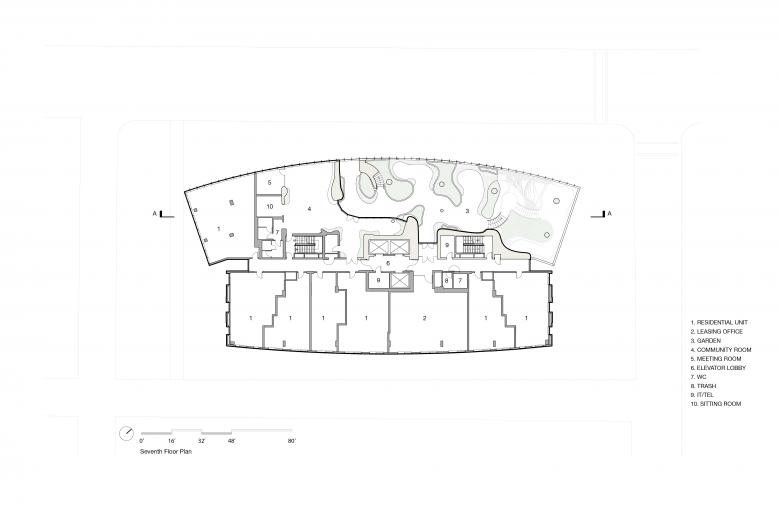 The building features 187 rental units spread across 15 floors, along with a 9,000-square-foot ground-floor retail space that seamlessly blends into the surrounding landscape and streetscape. Exterior materials and plantings flow into the interior, reinforcing the connection between indoors and outdoors.