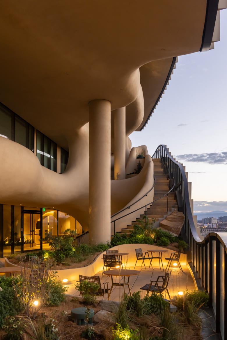 As residents traverse the building's canyon trail from the 6th to the 9th floor, they become immersed in curated environments inspired by Colorado’s foothill and canyon ecosystems, guided by the sounds of cascading water that is audible from the street below. With One River North, MAD seeks to reimagine urban living by integrating natural experiences into modern architecture, creating immersive living experiences that foster community and strengthen residents' connections to each other and the natural world.