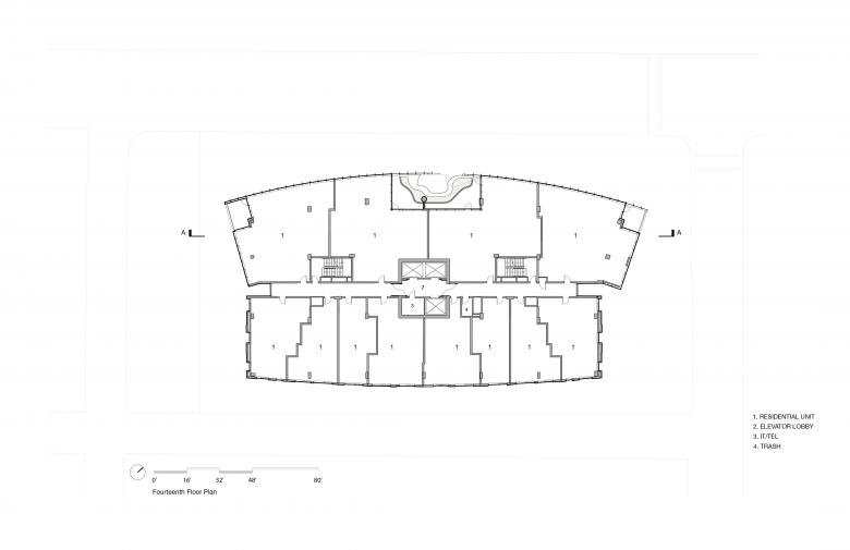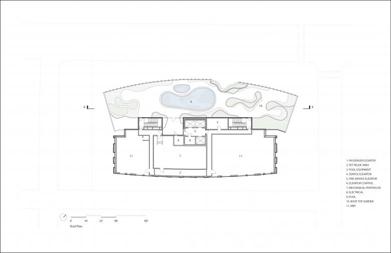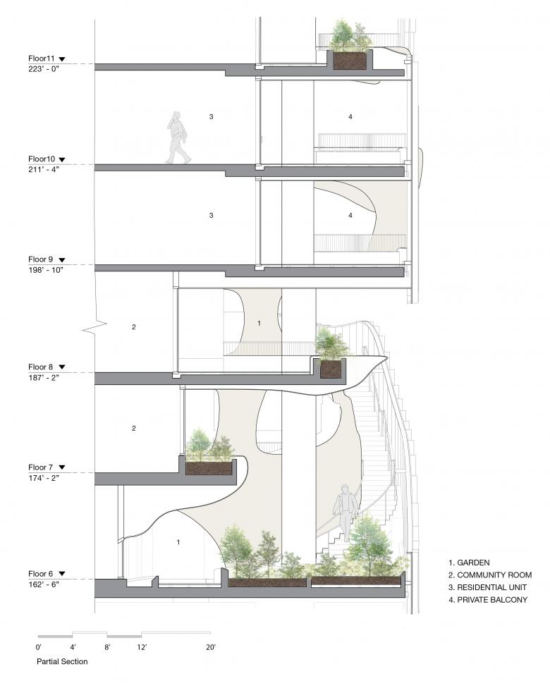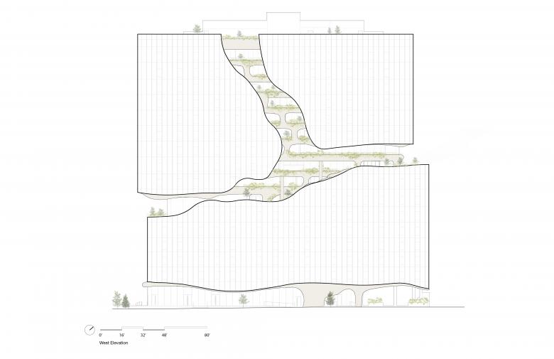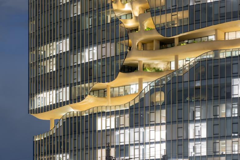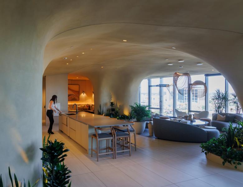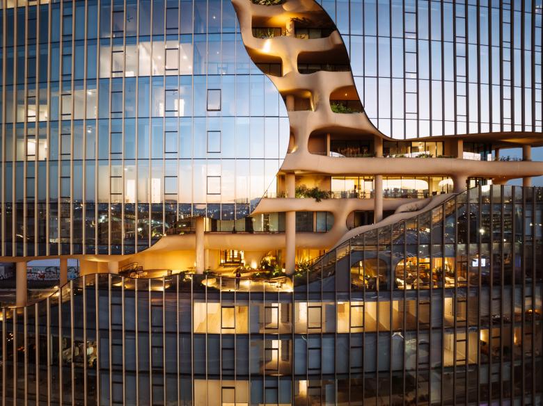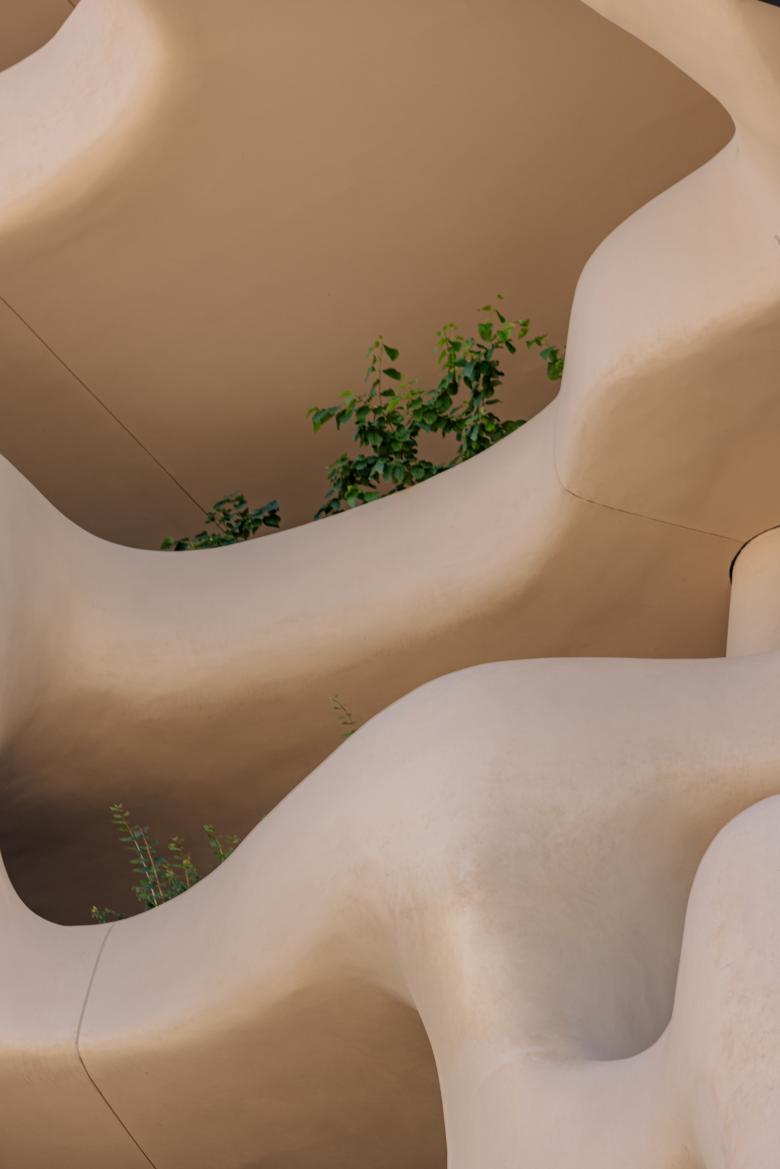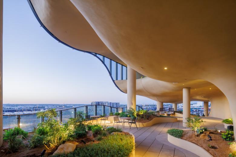 The soft surfaces of the Canyon—a carved-out, four-story amenity space inspired by natural erosion and designed to evoke a slot canyon, were designed by MAD to contrast the clean geometric lines of the building’s massing. This feature includes over 13,000 square feet of landscaped terraces that appear to hang in open space, offering some of the city's most breathtaking views, along with water elements that foster a strong connection between residents and the natural environment. The canyon-like structure running through the façade creates an immersive, natural experience, merging indoor and outdoor spaces and blurring the boundaries between nature and architecture.