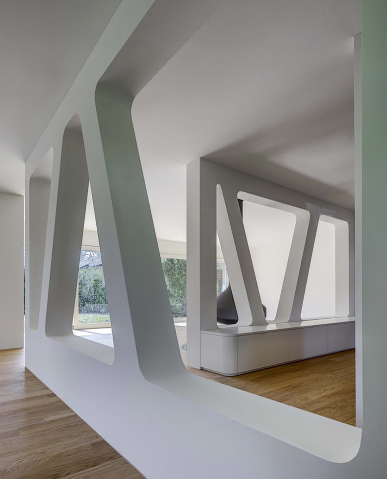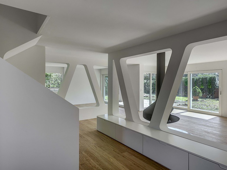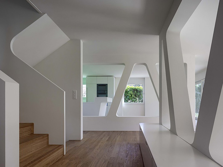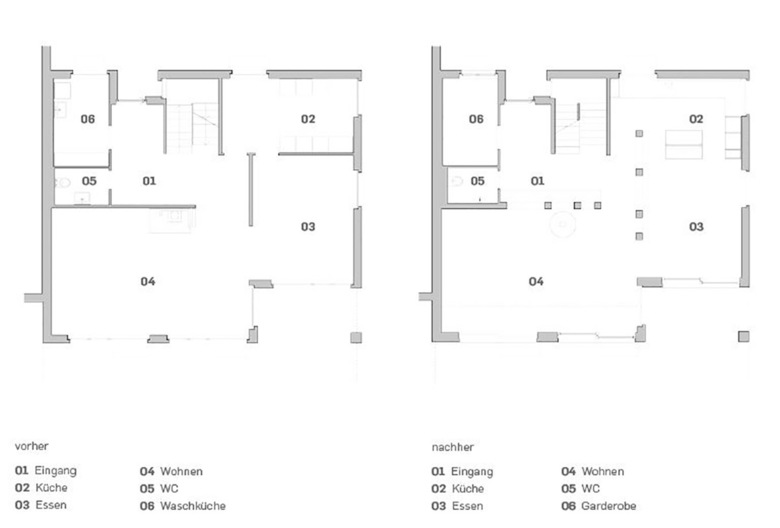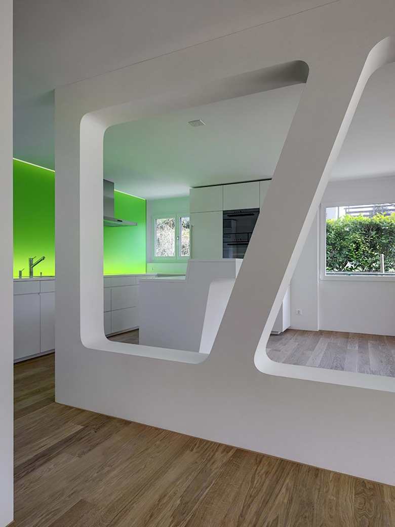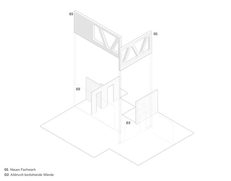 Als Teil einer in den frühen 1980er Jahren entstandenen grossen Wohnsiedlung in Zürich, ist das Einfamilienhaus durch eine Typologie mit teilweise minimalen Raumhöhen und kleinen Räumen charakterisiert. In einem konsequenten Schritt schlug vor, die Wände des Erdgeschosses durch zwei offene Fachwerkträger zu ersetzen und transformierte die abgetrennten kleinen Räume zu einem offenen multifunktionalen Raum, in dem Wohn-, Ess- und Küchenbereich visuell miteinander verbunden und gleichzeitig räumlich definiert sind.