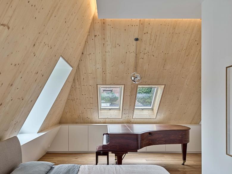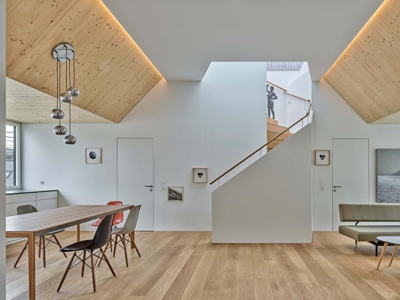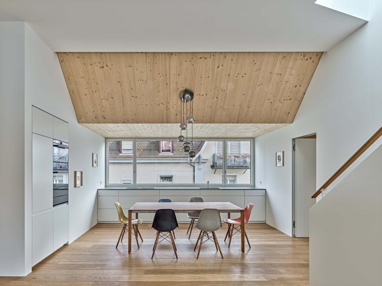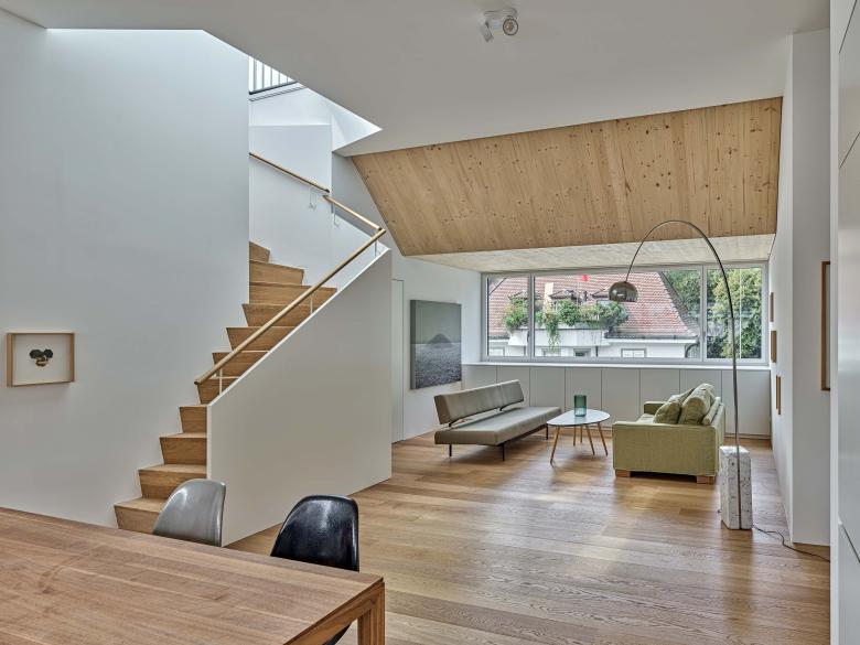 Mit wenigen Eingriffen in die bestehende Bausubstanz entstehen zwei flexible, zusammenschaltbare Wohneinheiten. Die Dachstruktur wird durch eine moderne Holzbaukonstruktion ersetzt, das ursprüngliche Satteldach weicht dem für Zürich typischen Zinnendach, das sich gut in die Dachlandschaft des Quartiers integriert. Grosszügige Lukarnen öffnen den Dachgeschossgrundriss zu den vier Himmelsrichtungen hin und bilden gleichzeitig einen Abschluss zur feingliedrigen bestehenden Fassade. Der neue Dachstuhl aus Holz wird von innen sichtbar und schafft eine moderne, nachhaltige Atmosphäre für die Wohnräume. Das Projekt schafft klare, symmetrische Strukturen, die eine langfristige Flexibilität sicherstellen und den Geist des historischen Gebäudes aus den 1920er Jahren unterstützen.
