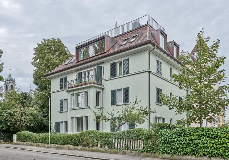 Das historische Mehrfamilienhaus aus den frühen 1920er Jahren befindet sich als Teil der Überbauung ‚Auf dem Bürgli’ inmitten der Grünanlagen Rieterpark und Belvoirpark in Zürich-Enge. Es zeichnet sich durch eine wohlproportionierte Architektur mit zurückhaltenden, eklektischen Elementen aus. Nachdem 2015 ein Weihnachtsbaum Feuer fing, wurde die Nutzung des Hauses überdacht und die Grundrisse flexiblen, zeitgenössischen Wohnformen angepasst. In einer ersten Etappe wurden die unteren Geschosse sowie die Fassade sanft umgebaut, um ihre Attraktivität als Familienwohnungen nicht zu verlieren. Nau2 wurde 2017 beauftragt, das 2. Obergeschoss zusammen mit dem Dachgeschoss zu einer grosszügigen Wohnung mit Dachterrasse umzubauen.